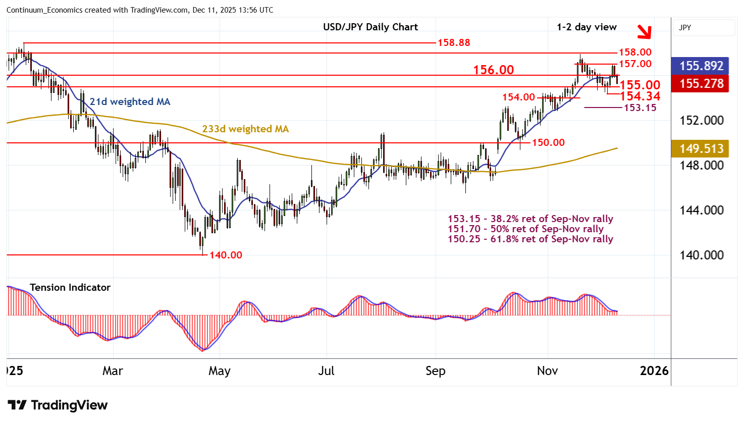 13:40 GMT - The anticipated pullback from 157.00 is extending, with the break below 156.00 adding weight to sentiment and putting focus on support at the 155.00 break level. Daily readings are turning down and broader weekly charts are mixed/negative, highlighting room for further losses in the coming sessions. A break below 155.00 will add weight to sentiment and open up the 154.34 weekly low of 5 December. A further close beneath here will confirm continuation of late-November losses, as 154.00 then attracts, ahead of the 153.15 Fibonacci retracement. Meanwhile, a close back above congestion resistance at 156.00, if seen, will help to stabilise price action and prompt consolidation beneath 157.00.