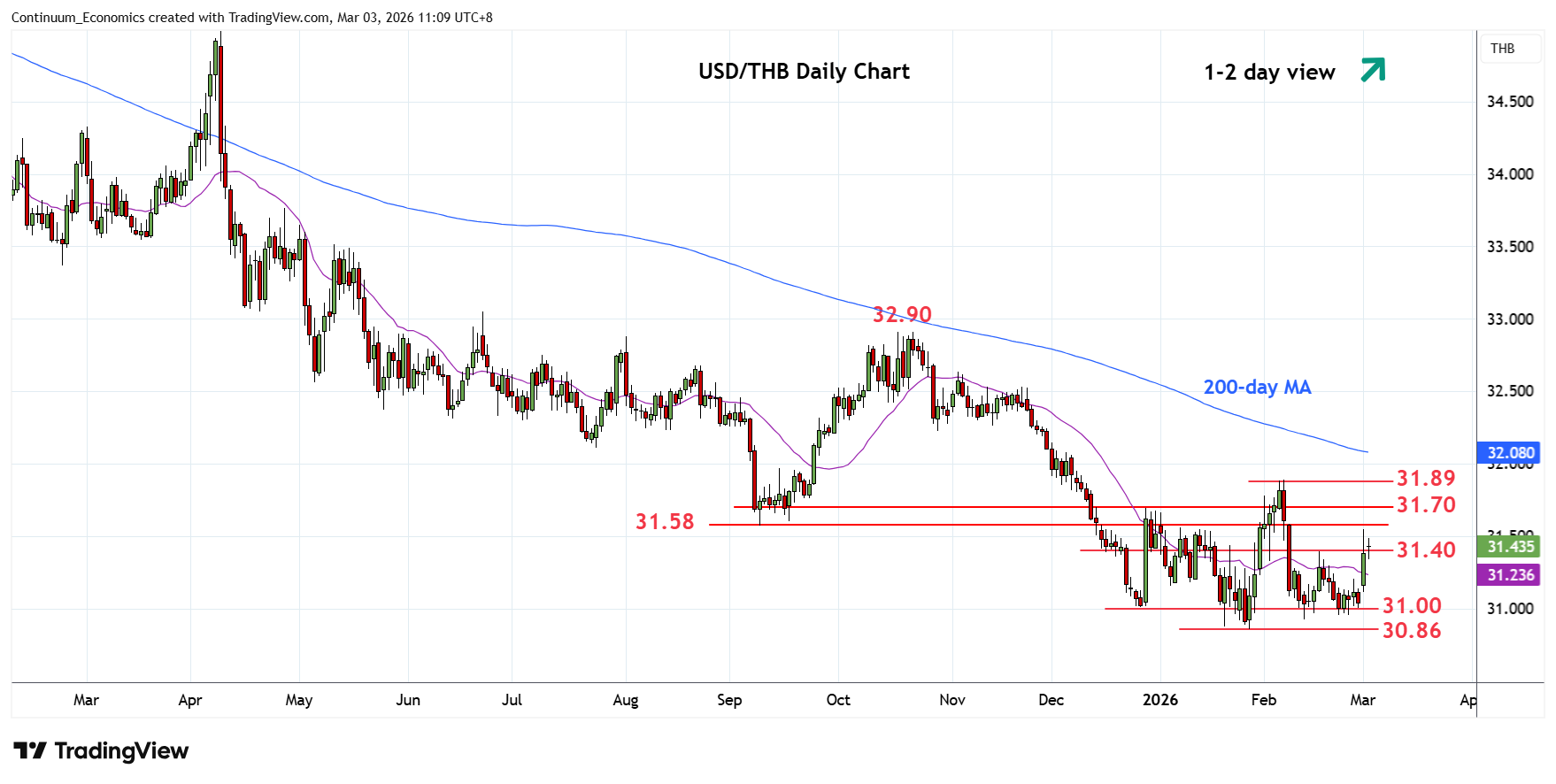 03:15 GMT - Consolidation above the 31.00 level has given way to sharp bounce as prices unwind the oversold daily studies. Break above the 31.40 resistance see room for stronger gains to retest strong resistance at the 31.58/60 area and 31.70 congestion. Higher still, will see scope for retest of the 31.89, February current year high. Meanwhile, support is raised to the 31.20 congestion which should underping and sustain gains from the 31.00/30.86, December low and the 28 January current year low.