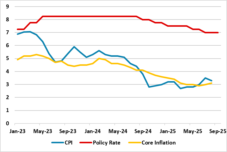 Bottom Line: South African Reserve Bank (SARB) held the policy rate at 7.0% during the MPC on September 18 as annual inflation hit 3.3% YoY in August which is above new inflation anchor coupled with surged core inflation. SARB governor Kganyago said on September 18 that MPC expects headline inflation to rise over the next few months, peaking at around 4%. Under current circumstances, cautious and data-dependent SARB will likely try to bring inflation down to new 3% anchor and assess impacts of earlier cuts before restarting easing cycle, particularly considering current geopolitical uncertainty and upside risks to the inflation outlook prevailing.