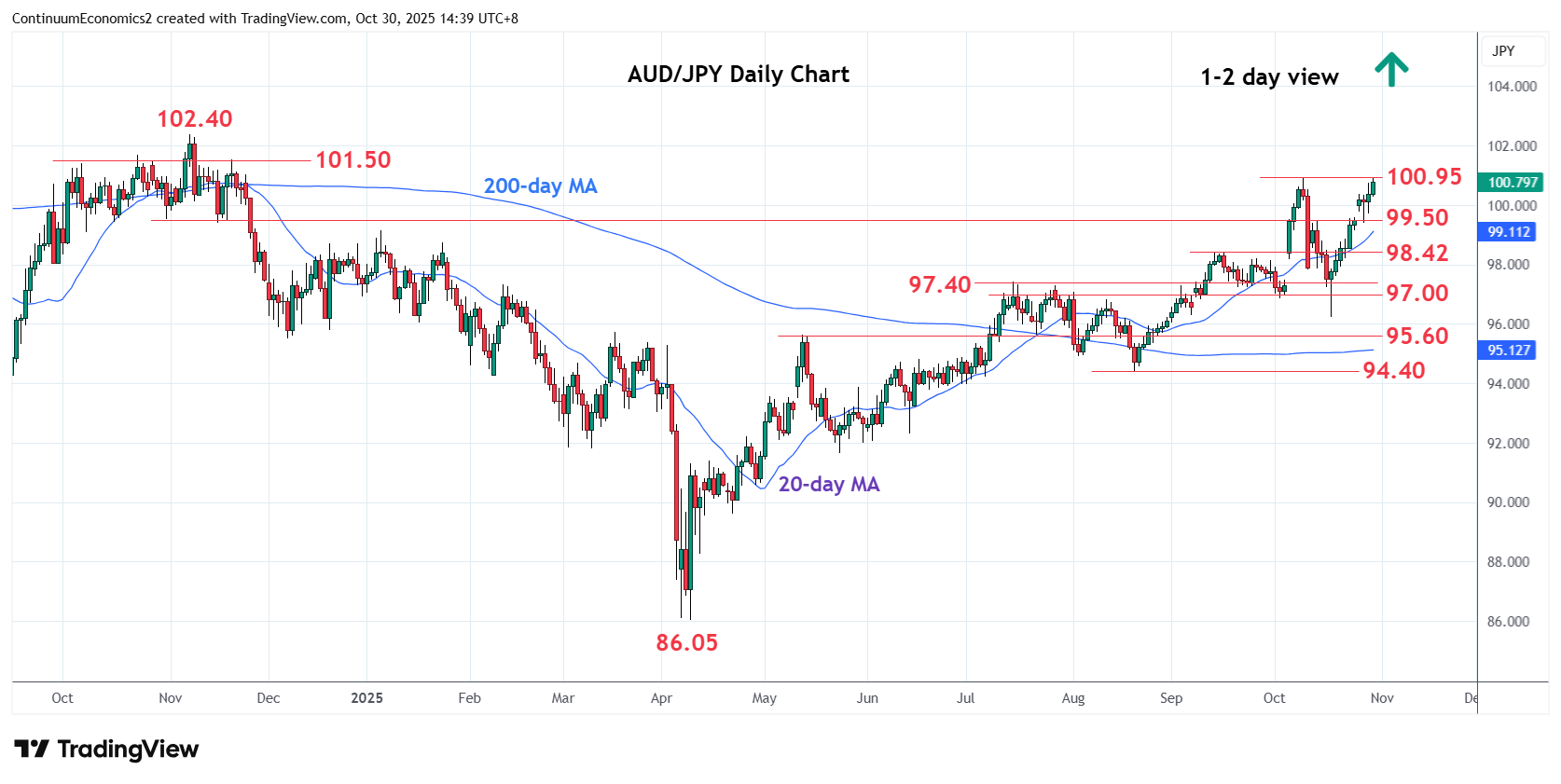 06:45 GMT - Break above the 100.00 level has seen gains to retest the 100.95 current year high. Clearance here will extend bullish gains from the April low and see room to the 101.50 resistance and 102.40, November 2024 high. Would expect reaction at these level as daily studies push deep into overbought areas. Clearance, will further retrace losses from the 109.35, July 2024 year high. Meanwhile, support is at the 99.50 congestion. Would take break here to fade the upside pressure and see room for deeper pullback to 98.42 and 97.40, September/July highs.