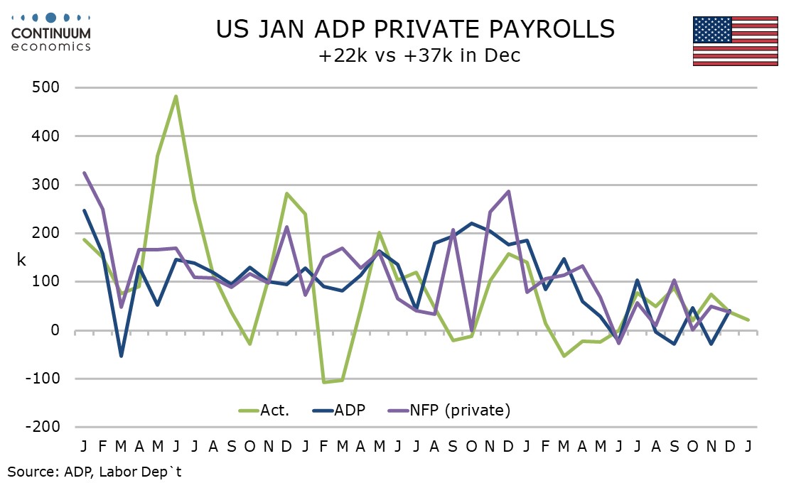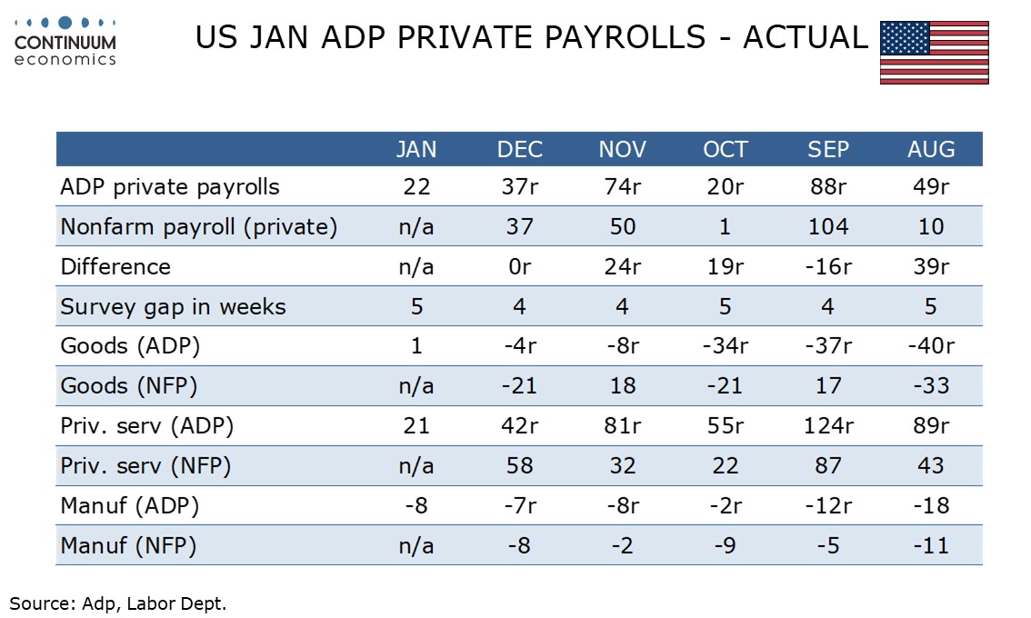 January’s ADP’s estimate of private sector employment of 22k falls short of expectations. We still see scope for non-farm payrolls to outperform the ADP data given very low initial claims and positive seasonal adjustments, though a recent tendency for ADP data to underperform payrolls is no longer there after historical revisions to the ADP data.