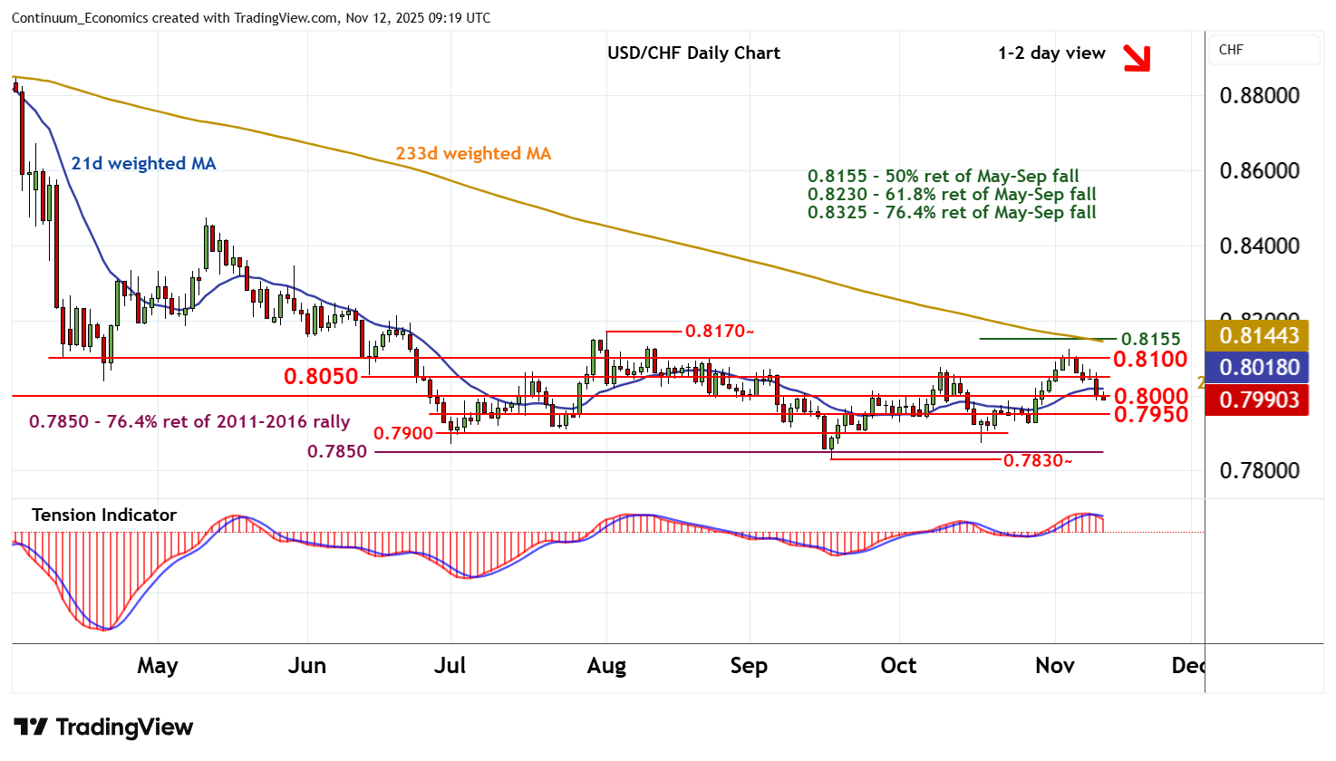 09:15 GMT - Little change, as prices extend cautious trade around congestion support at 0.8000. Intraday studies are negative and both daily stochastics and the daily Tension Indicator are also falling, highlighting room for a fresh break beneath here and a test of congestion support at 0.8000. However, positive weekly charts should prompt fresh consolidation around here. Meanwhile, a close back above resistance at the 0.8050 break level would help to stabilise price action and prompt consolidation beneath 0.8100.