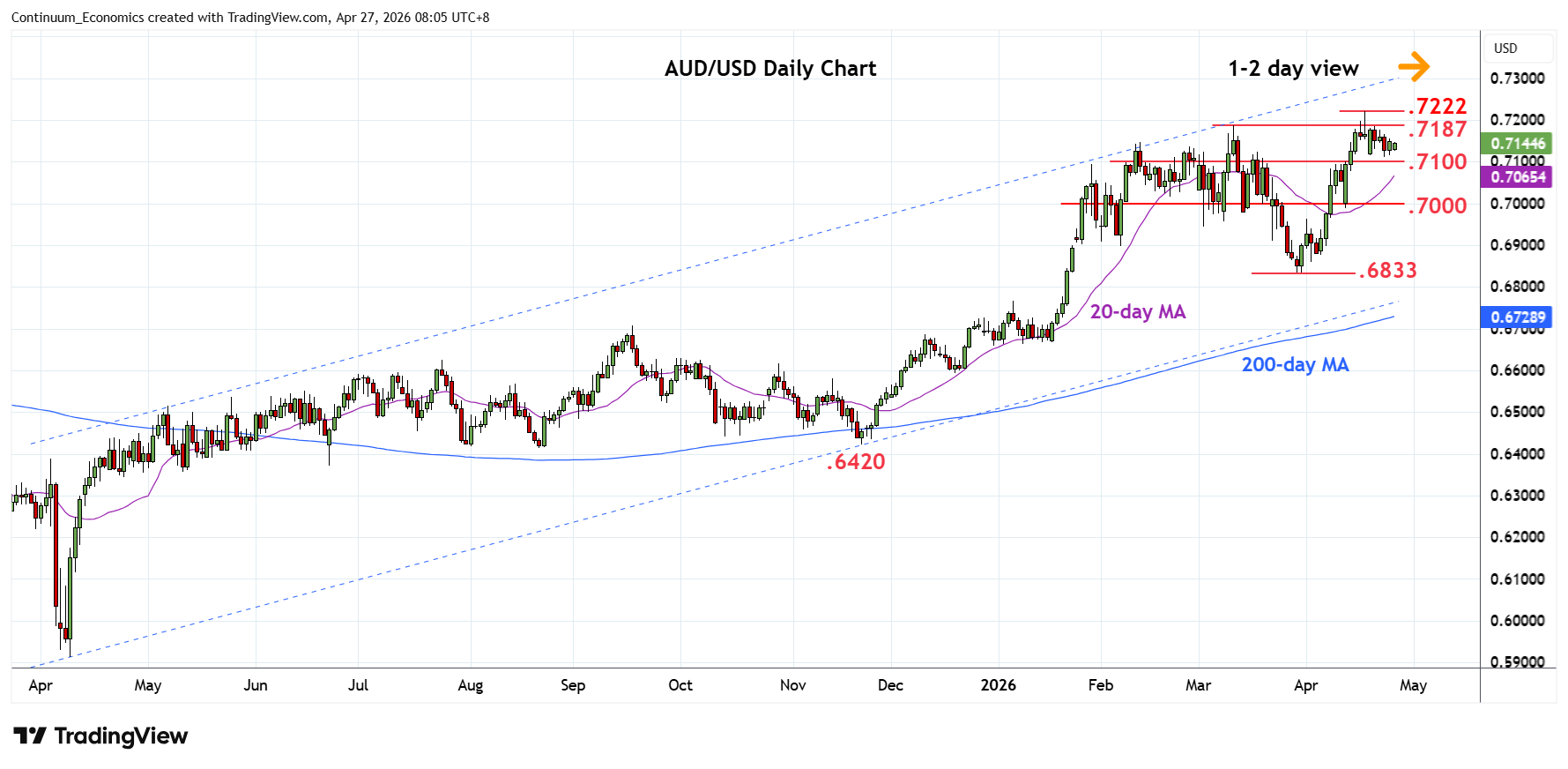 00:10 GMT - Little change, as prices extend consolidation above the .7100 level following rejection from the .7222, 17 April current year high. However, a deeper pullback to retrace gains from the .6833 March YTD low cannot be ruled out with break to see scope to strong support at the .7050/.7000 area which is expected to underpin. Pullback expected to meet with buying interest later to retest the .7187 and .7222, March/April highs. Clearance will extend the underlying bull trend from the April 2025 year low and see room for extension to resistance at the .7280/.7300 area.