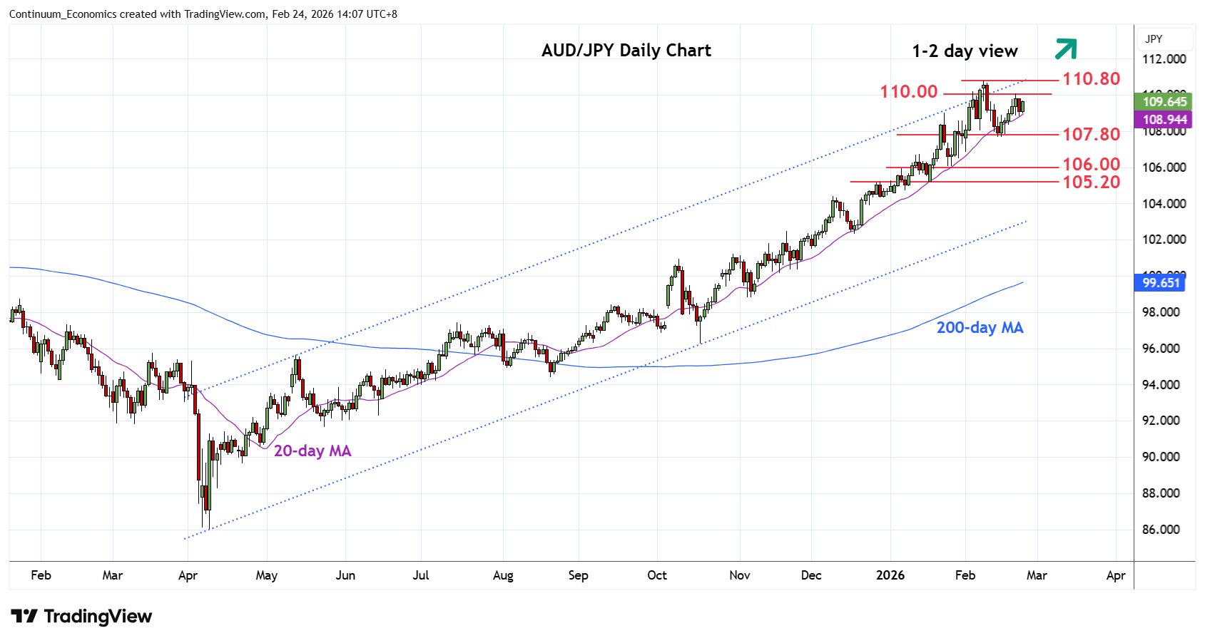 06:20 GMT - Consolidating test of the 110.00 level following bounce from support at the 108.00/107.80 area. Clearance here will see scope for retest of the 9 February current year high at 110.80 where reaction can be expected to unwind the overbought weekly studies. Break here, if seen, will extend the broader gains from the 2020 year low and see room to the 112.00/113.00 congestion area. Meanwhile, support at the 108.00/107.80 support underpinand see break here needed to fade the upside pressure and open up room for deeper pullback retrace strong gains from the 86.00, April 2025 year low.