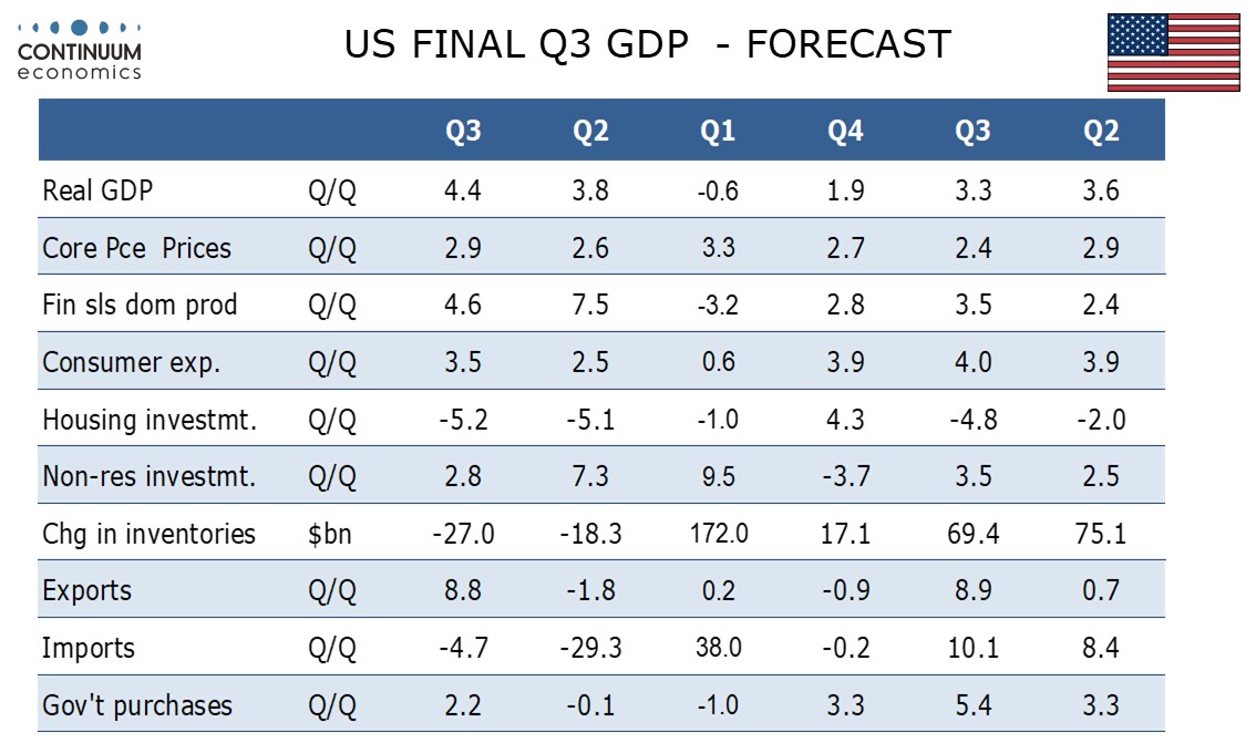 We expect a marginal upward revision to Q3 GDP to 4.4% from an already strong 4.3%. The only component we are expecting a revision to is inventories, on an upward revision to September retail inventories led by autos.