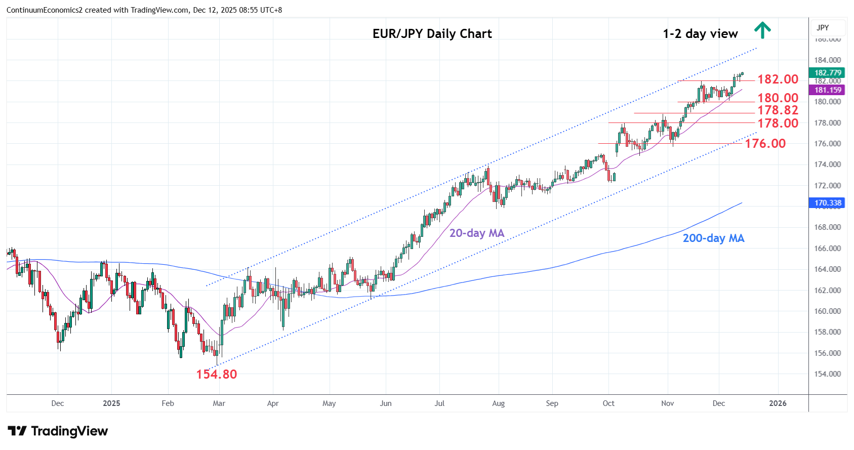01:10 GMT - Pressure remains on the upside as prices extend break above the 182.00 level to test resistance at the 182.60/183.00 area. Bullish momentum keep pressure on the upside though the overbought daily and weekly studies caution corrective pullback. Higher still will see room to the 184.00/50 congestion and channel resistance. Meanwhile, support is at the 182.00/181.50 November highs which now underpin. Would take break here to ease the upside pressure and open up room for deeper pullback to retest strong support at the 180.00 level.