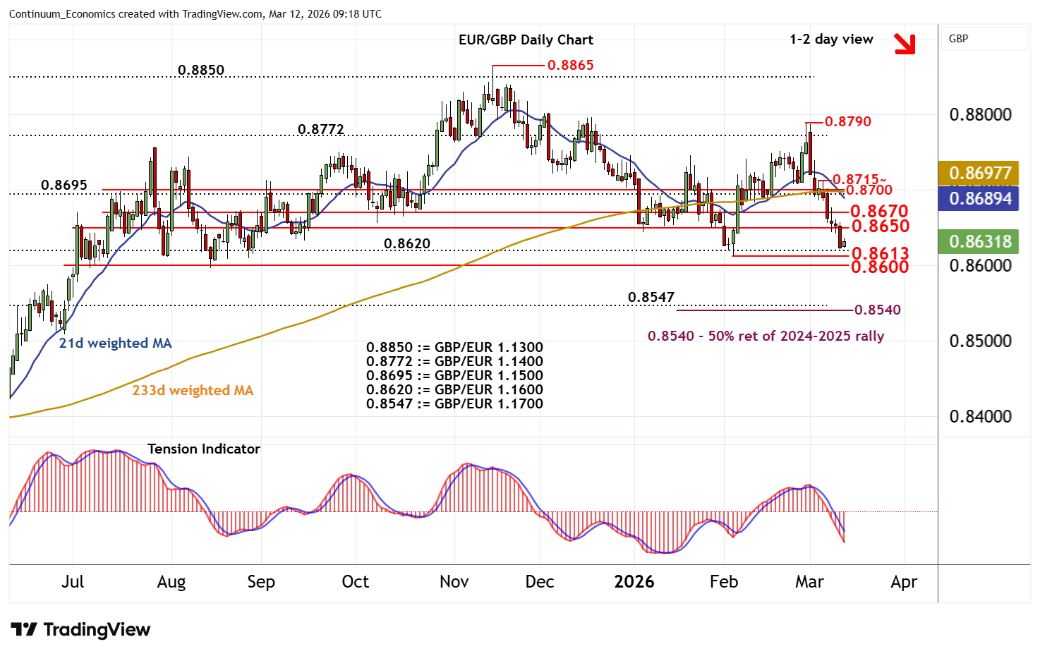 09:10 GMT - Anticipated losses are giving way to consolidation above critical support at the 0.8613 current year low of 4 February and 0.8620, (GBP/EUR 1.1600), as oversold daily stochastics flatten. A minor bounce is possible, but the bearish daily Tension Indicator and negative weekly charts should limit scope in renewed selling interest towards congestion resistance at 0.8650. Following cautious trade, fresh losses are looked for. A break below 0.8613/20 will add weight to sentiment and extend November losses below congestion around 0.8600 towards 0.8540/47.