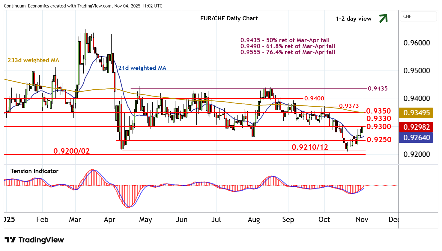 10:45 GMT - The anticipated break above 0.9300 has been pushed back from 0.9315~, as intraday studies turn down, with prices currently balanced around 0.9300. Daily readings are positive and oversold weekly stochastics are unwinding, highlighting room for a fresh break above here. Focus will turn to congestion resistance within the 0.9330/50 range. But the flat weekly Tension Indicator is expected to limit any initial tests in renewed selling interest/consolidation. Meanwhile, support remains down to the 0.9250 break level, and should underpin any immediate setbacks.