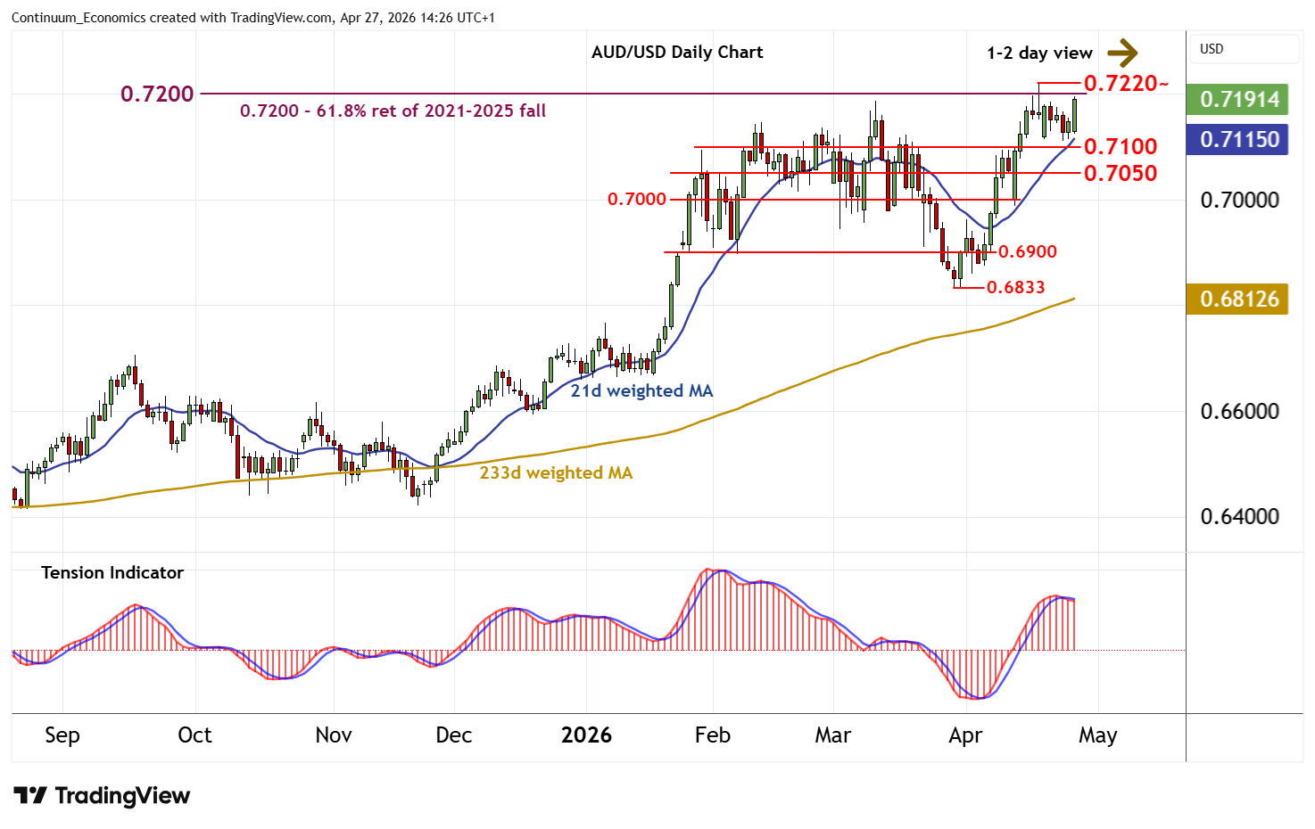 14:20 BST - Cautious trade is giving way to a push higher, as intraday studies improve, with prices approaching strong resistance at the 0.7200 Fibonacci retracement. Just higher is the 0.7220~ current year high of 17 April. But flat negative daily readings are expected to limit any initial tests of this range in consolidation. Broader weekly charts are mixed/positive, pointing to room for further strength. But a close above here is needed to turn sentiment positive once again and extend April 2025 gains towards the 0.7280~ high of June 2022. Meanwhile, support remains at congestion around 0.7100 and should underpin any immediate tests lower.