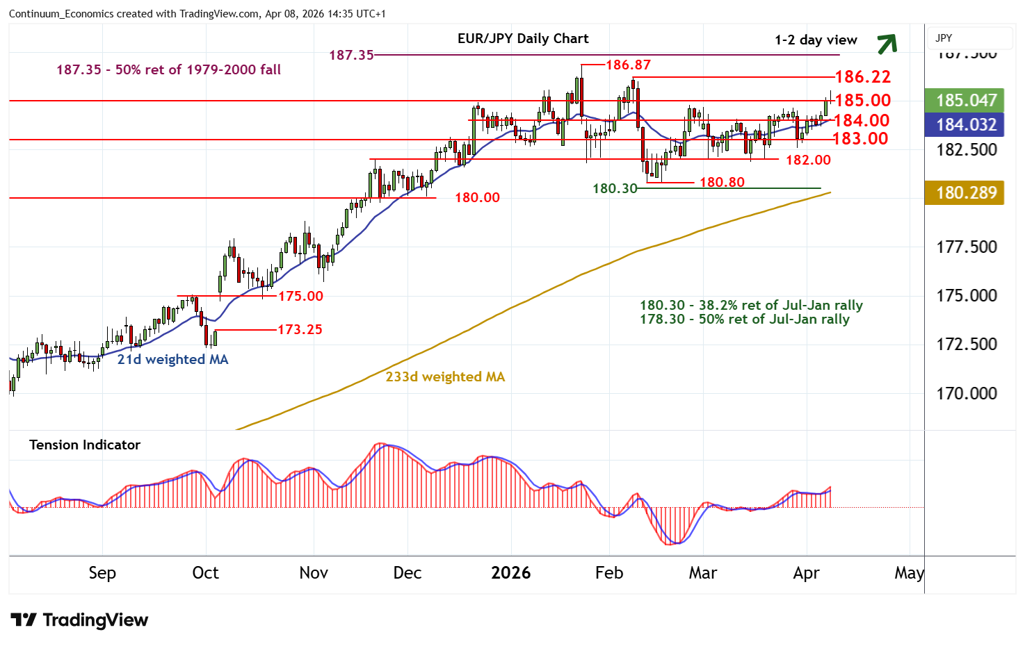 Anticipated gains have extended to 185.55, before settling lower into consolidation around 185.00