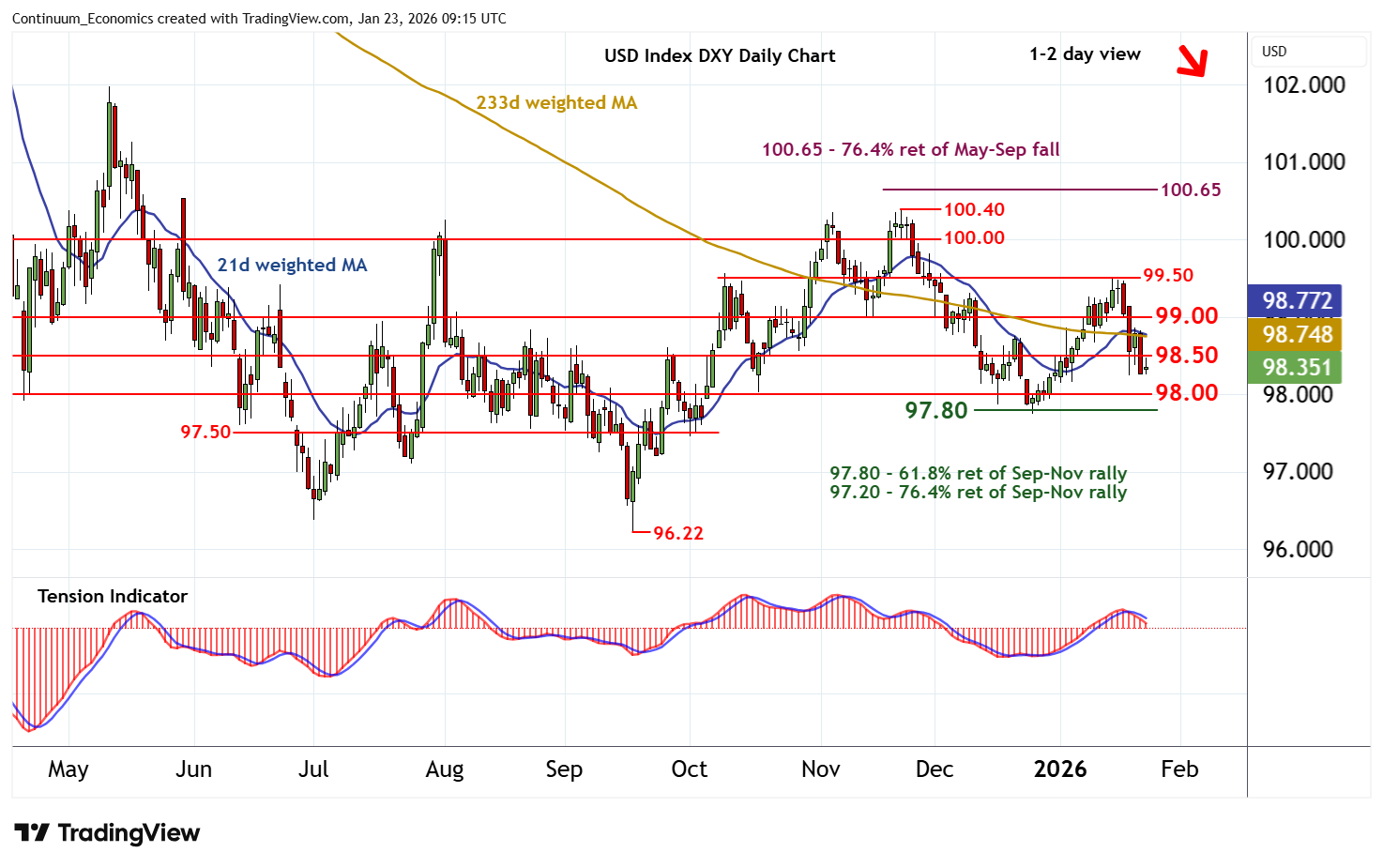 09:10 GMT - Cautious trade has given way to anticipated losses, with prices currently balanced above the 98.25 low of 20 January. Daily stochastics and the daily Tension Indicator continue to track lower, highlighting room for further losses, with focus to turn to strong support at the 97.80 Fibonacci retracement and congestion around 98.00. Oversold daily stochastics could limit any initial tests in consolidation, before deteriorating weekly charts prompt a break and extend mid-January losses towards 97.50. Meanwhile, resistance is lowered to congestion around 98.50. A close above here, if seen, will help to stabilise price action and prompt consolidation beneath further congestion around 99.00.