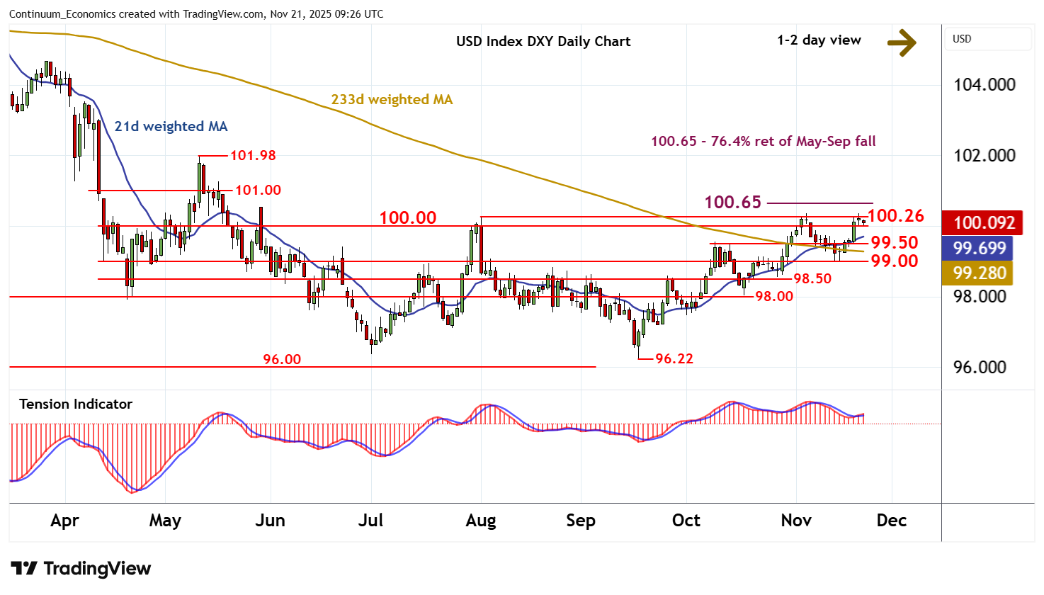 09:10 GMT - Little change, as prices extend cautious trade within strong resistance at congestion around 100.00 and the 100.26 monthly high of 1 August. Intraday studies are under pressure, highlighting room for a break back below 100.00. But rising daily stochastics and the positive daily Tension Indicator should limit scope in renewed consolidation/buying interest above support at the 99.50 break level. Following cautious trade, fresh gains are looked for. A break above 100.00/26 will improve sentiment and extend mid-September gains towards the 100.65 Fibonacci retracement, where mixed weekly charts could prompt fresh selling interest/consolidation.