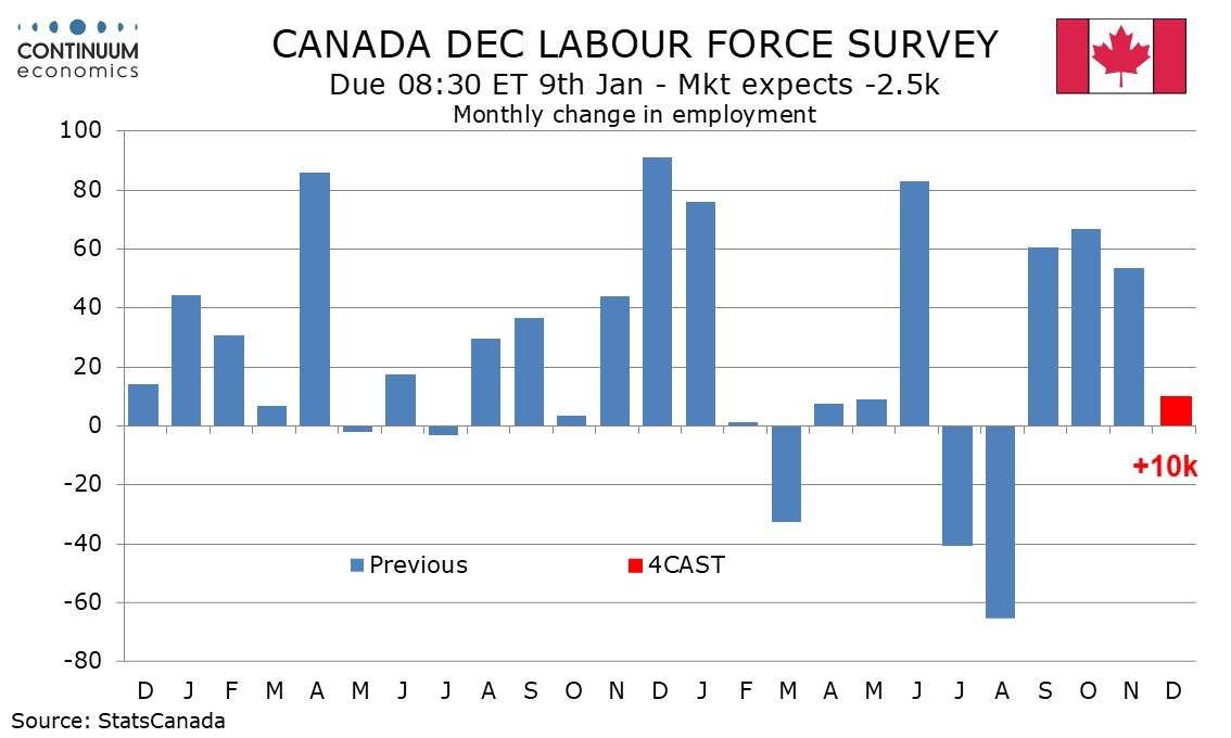 We expect Canadian employment to increase by 10k in December, a number that is probably closer to trend than the three straight strong gains averaging close to 60k. We expect unemployment to correct higher to 6.7% from 6.5% in November, still below October’s 6.9% and the 7.1% highs of July and August. Again, our forecasts are close to consensus, although the market anticipates a small drop in employment, Nevertheless, this wouldn’t be too significant after the recent strong gains, and the CAD ought to hold fairly steady, although there is still scope for the recent USD/CAD correction higher to extend towards 1.3950 in a strong USD environment.