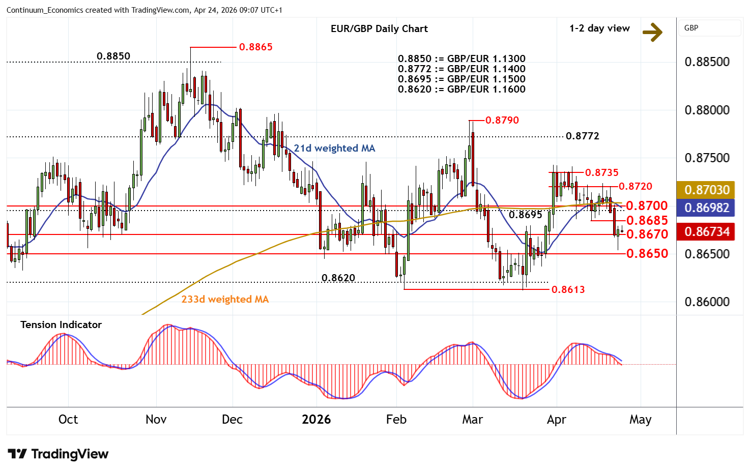08:55 BST - The anticipated break below 0.8670 has met short-covering above congestion support at 0.8650, with rising intraday studies and flattening oversold daily stochastics prompting a bounce back above 0.8670. The daily Tension Indicator continues to track lower and broader weekly charts are mixed/negative, suggesting any further gains should find difficulty sustaining tests above resistance at the 0.8685 weekly low of 14 April. In the coming sessions, consolidation is looked for. However, a close below congestion support at 0.8670 will add weight to sentiment and put focus back on 0.8650.
