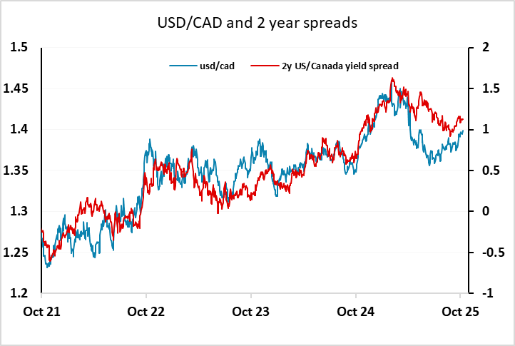 USD/CAD made a 5 month high on Thursday above the May 19 high of 1.3973, supported by a generally USD positive tone. The Fed is still priced as a 95% chance to cut rates 25bp at the October 29 meeting, so if both go ahead, there is scope for the CAD to weaken further, with a USD/CAD likely to trade above 1.40. We have already nearly returned to the level consistent with the historic correlation with 2 year yield spreads, so we wouldn’t see a lot of CAD downside, and there would likely be a bigger reaction if the BoC don’t cut. So a large rise in employment could be expected to result in a significant CAD recovery, as the market reduces its expectation of easing. But this looks less likely than a USD/CAD test above 1.40 on a consensus number.
