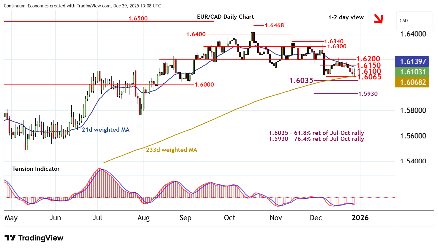 12:50 GMT - The anticipated test of congestion support at 1.6100 has extended to the 1.6065 weekly low of 8 December, where rising intraday studies are prompting a smart bounce back above 1.6100. Focus is turning to congestion resistance at 1.6150. But deteriorating daily readings and negative weekly charts are expected to limit any tests in renewed selling interest/consolidation. Following cautious trade, fresh losses are looked for. A close below 1.6065 will turn sentiment negative and extend mid-October losses towards the 1.6035 Fibonacci retracement.