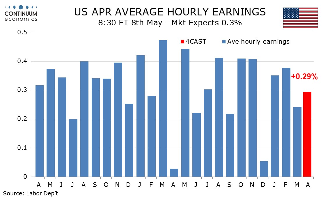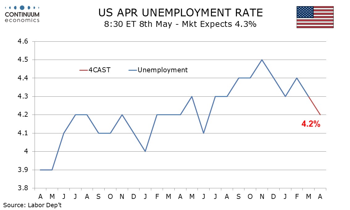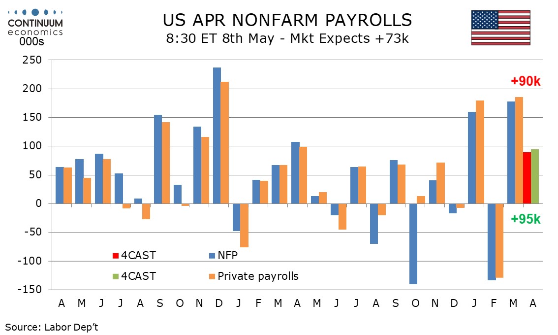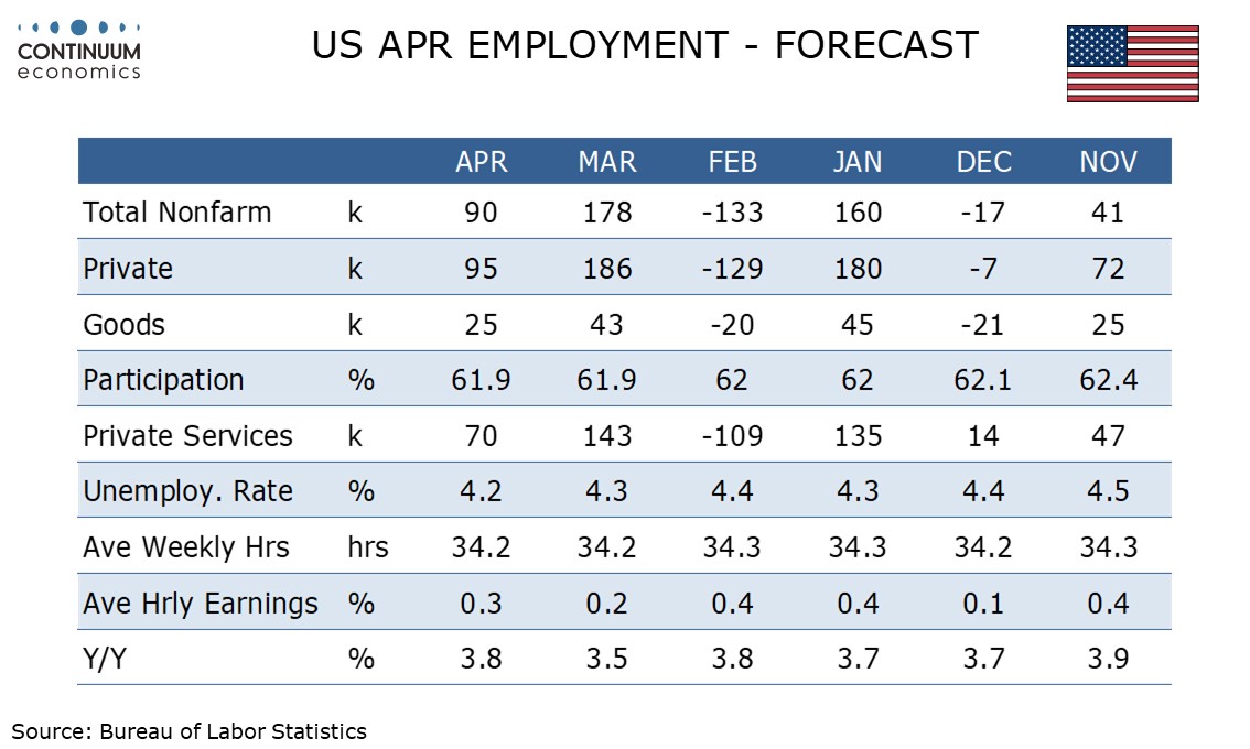 We expect April’s non-farm payroll to rise by 90k overall and by 95k in the private sector, less strong than in March but implying some improvement in trend. We expect unemployment to slip to 4.2% from 4.3% and an in line with trend 0.3% increase in average hourly earnings.
