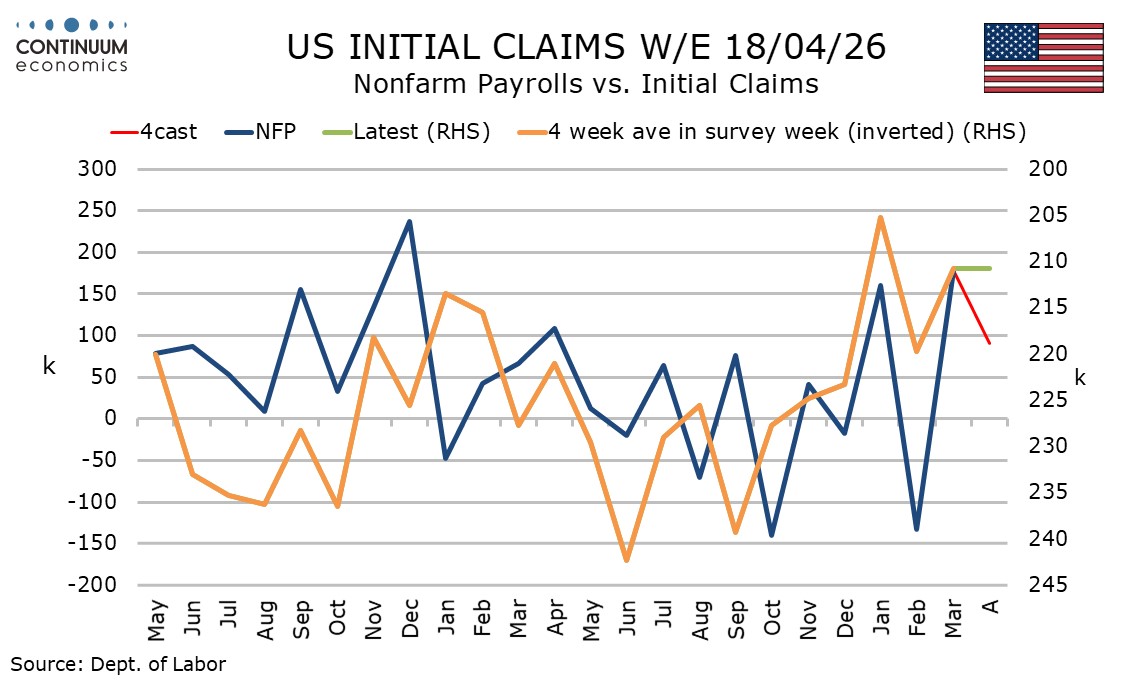 There are a number of signals for labor market improvement, with initial claims remaining low and continued claims resuming a downtrend. Weekly ADP data suggests job growth is averaging 40k per week, though this may be catch up with March’s strong payroll which ADP data underperformed.