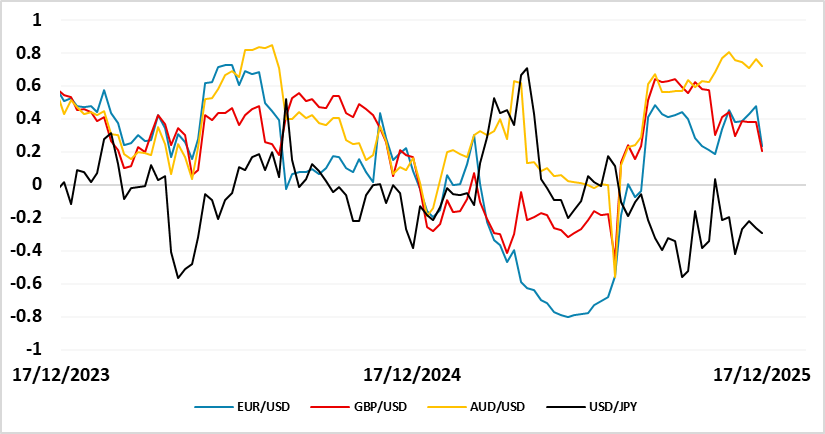 Figure 2: Correlation of one week changes in FX with one week changes in S&P – 3 month rolling