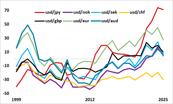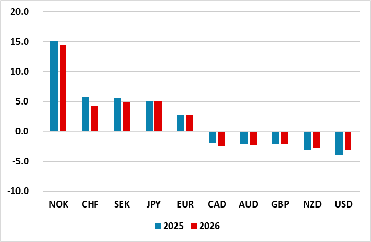 · Bottom Line: We expect some modest USD losses across the board over the next couple of years, but there is much more scope for losses against the JPY, AUD and NOK than the other G10 currencies, as yield spreads have moved dramatically in favour of these currencies, and the currencies have hugely underperformed. Which performs best in any period will likely depend on risk sentiment, but over the longer run all ought to make gains across the board.
