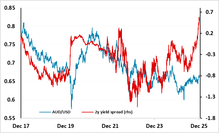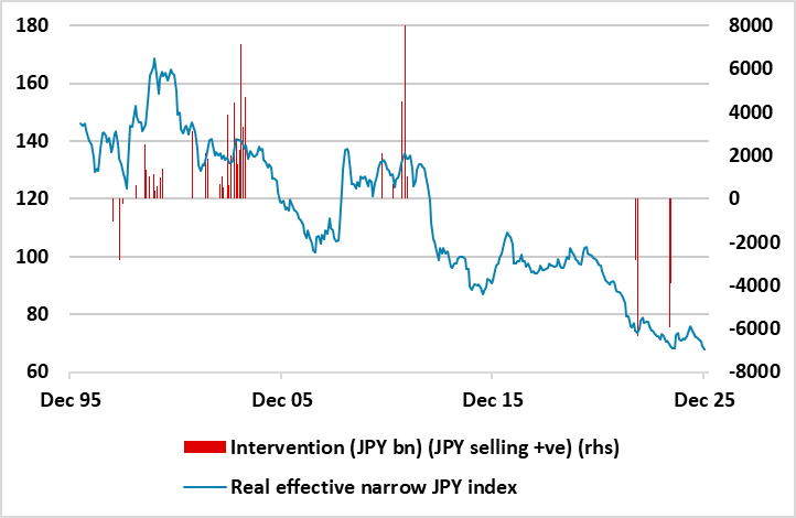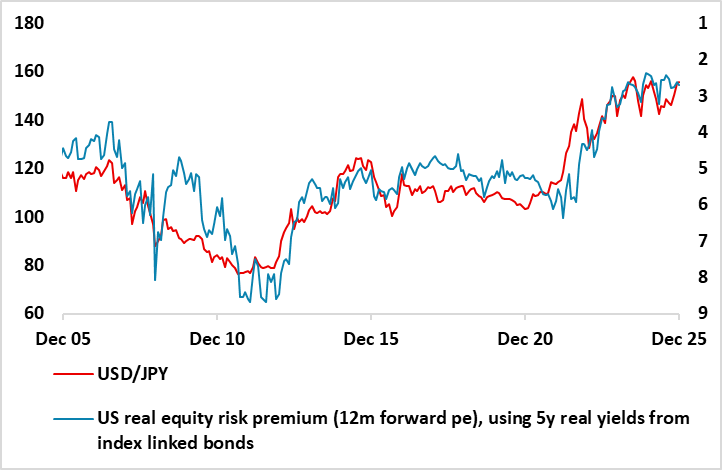 Q4 saw the JPY weaken significantly with the election of Takaichi as the LDP leader and Prime Minister being the trigger. There were some concerns expressed about the potential for Takaichi to follow “Abenomics” – involving both easier fiscal and monetary policy. However, while Takaichi has passed an expansionary budget, it is not substantially different from previous budgets, and more importantly, monetary policy and QT is still being left to the BoJ. Typically, expansionary fiscal policy is currency positive if accompanied by independent monetary policy because it will normally lead to higher yields than would otherwise have been the case, and all the indications are that the BoJ will continue on its tightening cycle provided that the economy shows the expected nominal growth. JGB yields have moved significantly higher in recent months, and the historic relationship between yield spreads and USD/JPY suggests USD/JPY should already be a lot lower (Figure 4).