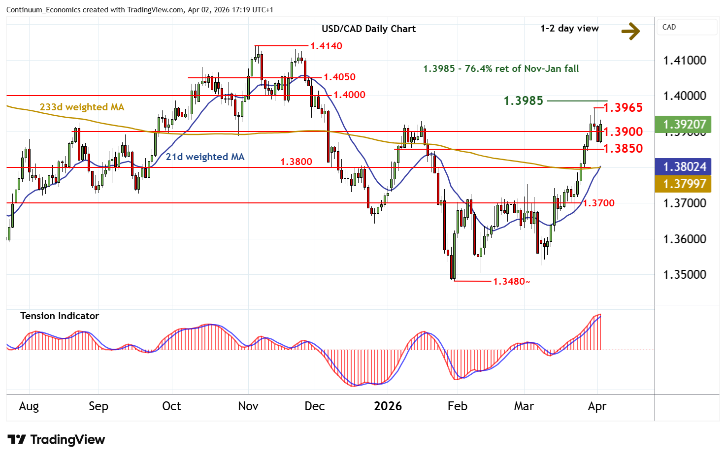 17:00 BST - Anticipated tests lower have proven shallow, as oversold intraday studies unwind, with prices bouncing from support at the 1.3870 congestion lows into fresh consolidation above 1.3900. Daily readings continue to fall, however, suggesting any immediate gains could be limited in consolidation beneath the 1.3965 current year high of 31 March and the 1.3985 Fibonacci retracement, before rising weekly charts prompt a break. A close above here would turn sentiment positive and extend January gains beyond congestion resistance at 1.4000. Meanwhile, support is down to congestion around 1.3850, and should underpin any immediate tests lower.