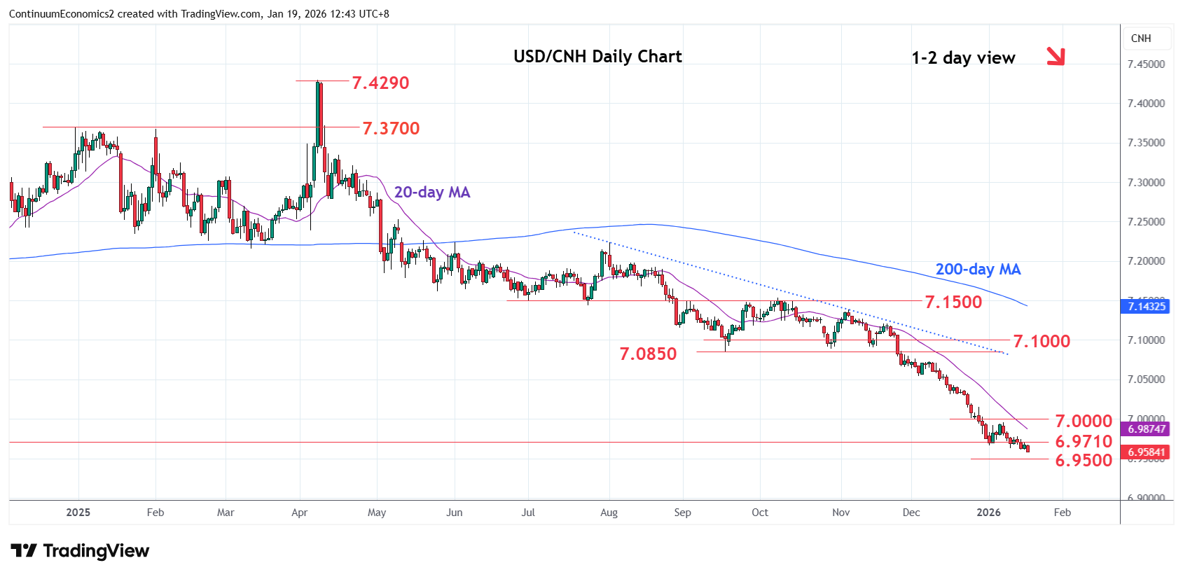 04:50 GMT - Prices remains under pressure as break of the 6.9710 support gives way to drift lower to extend losses from the 7.4290 April high. Lower will see room for extension to support at the 6.9500/6.9300 congestion area. Below this will see potential to target the 6.9000 level. Meanwhile, resistance is lowered to the 2024 year low at 6.9710 and extending to the 6.9960, 8 January bounce high. Would need to regain these and the 7.0000 level to ease the downside pressure and open up room for stronger corrective bounce to retrace losses from the October swing high.