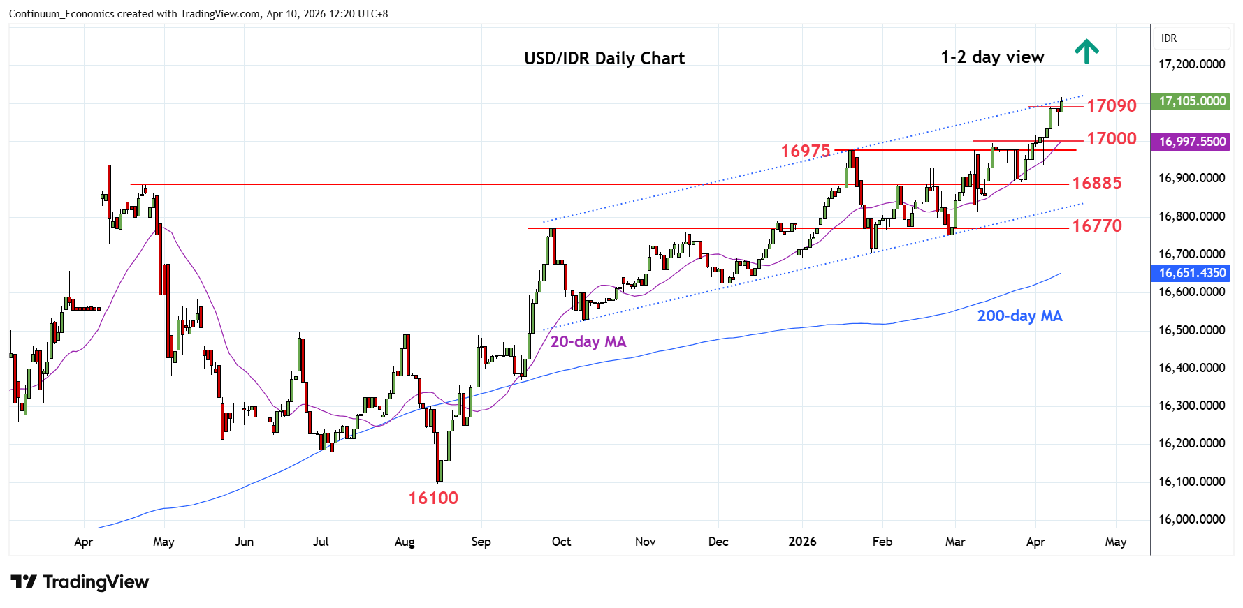 04:20 GMT - Consolidation below the 17090 high has given way to break to extend the underlying bull trend to reach fresh intraday high at 17115. Nearby see room to target the 17200/400 projection area but overbought daily and weekly studies caution corrective pullback. Meanwhille, the recent March and January highs at 16995/16975 now turned support should underpin. Would take break here to fade the upside pressure and see room for deeper corrective pullback to strong support at the 16900/16885 congestion area.