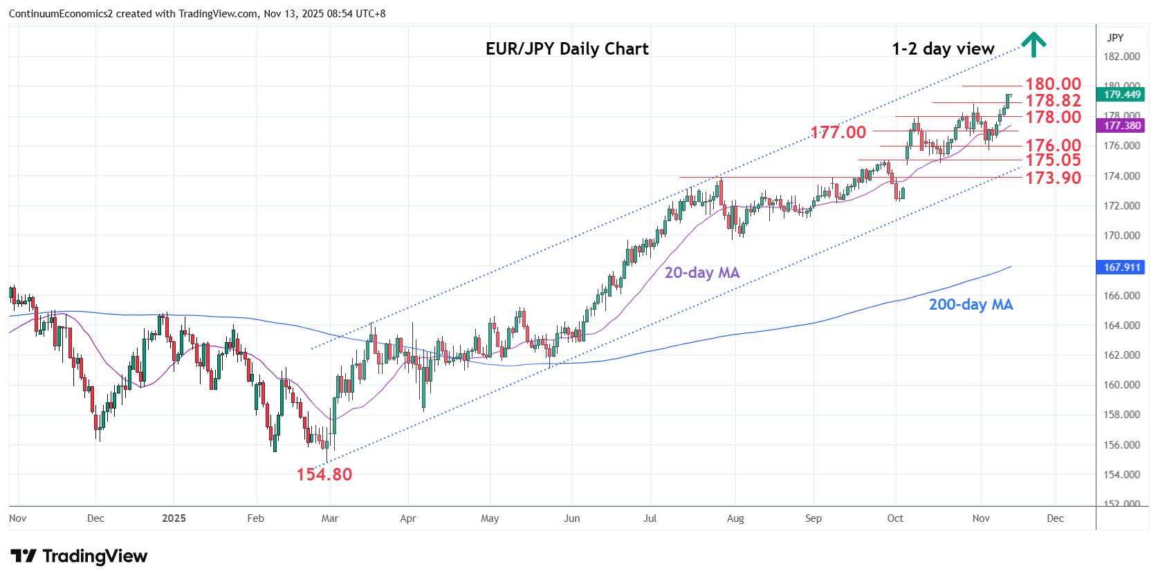 01:00 GMT - Break of the 178.82 October high has seen extension to reach fresh multi-year high at 179.48. Bullish structure from the February low suggest scope for further extend gains within the rising channel and higher will see room to 180.00 figure where reaction can be expected as daily and weekly studies push deep into overbought areas. Meanwhile, support is raised to the 178.00/177.00 congestion area. Would take break here to open up room for deeper pullback to the 176.00/175.70, congestion and 5 November low.