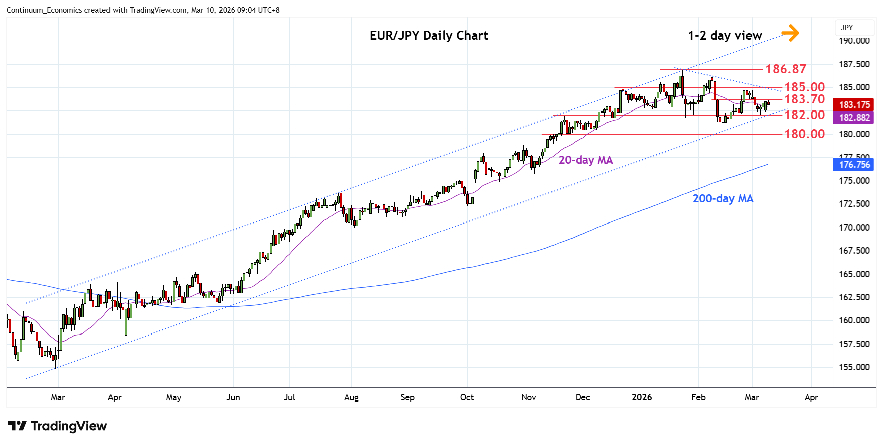 01:25 GMT - Higher in consolidation from the 182.00 level and channel support from the February 2025 year low to approach resistance at 183.70. However, negative daily and weekly studies suggest consolidation expected to give way to renewed selling pressure later and where break of 182.00 level will open up room for retest of the 180.80, February current year low. Below this will extend the broader losses from the January high to retrace rally from the February 2025 low. Meanwhile resistance at the 183.70/184.00 congestion is expected to cap and sustain losses from the 184.78, 25 February lower high.