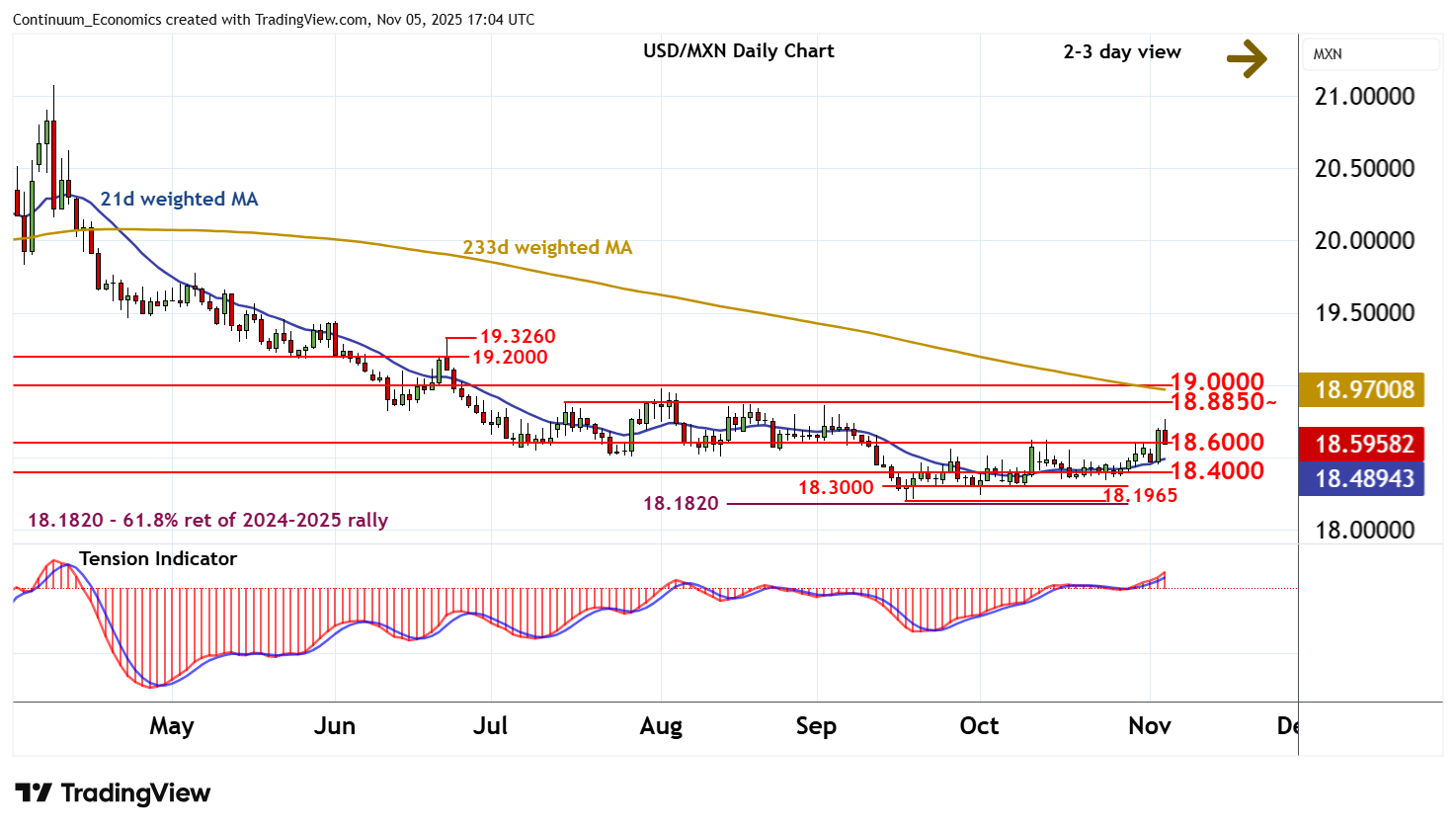 16:50 GMT - Quiet trade has given way to a break above 18.6000, with prices reaching 18.7675 before settling back to 18.6000. Overbought daily stochastics are unwinding, highlighting room for a break back beneath here. But the rising daily Tension Indicator and improving weekly charts should limit scope in renewed buying interest/consolidation above congestion support at 18.4000. Following cautious trade, September gains are expected to focus on strong resistance within the 18.8850 - 19.0000 range. Overbought daily stochastics could limit any initial tests in consolidation.