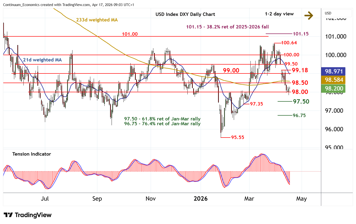 | R2 | 99.00/18 | ** | congestion; 8 Apr high | S3 | 97.35 | * | 23 Feb (w) low | |