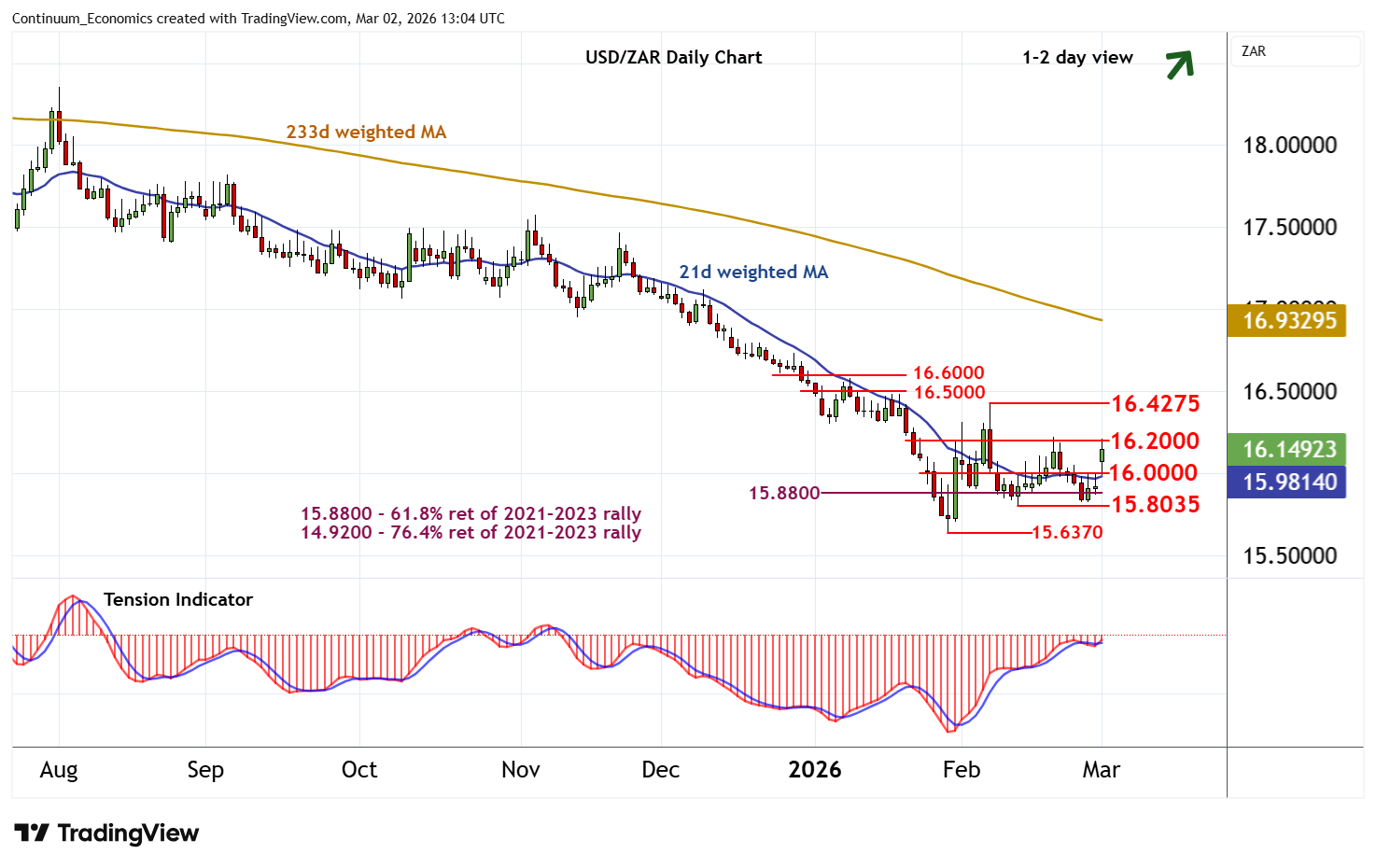 12:50 GMT - Cautious trade has given way to a sharp reactive break higher, with prices currently consolidating the test of resistance at 16.2000. Daily readings have turned positive broader weekly charts are improving, highlighting room for further gains in the coming sessions. A break above 16.2000 will open up the 16.4275 monthly high of 6 February. But by-then overbought daily stochastics could limit any initial tests in profit-taking/consolidation. Meanwhile, support is raised to congestion around 16.0000. A close back beneath here will stabilise price action and prompt consolidation above strong support at the 15.8035 monthly low of 12 February.