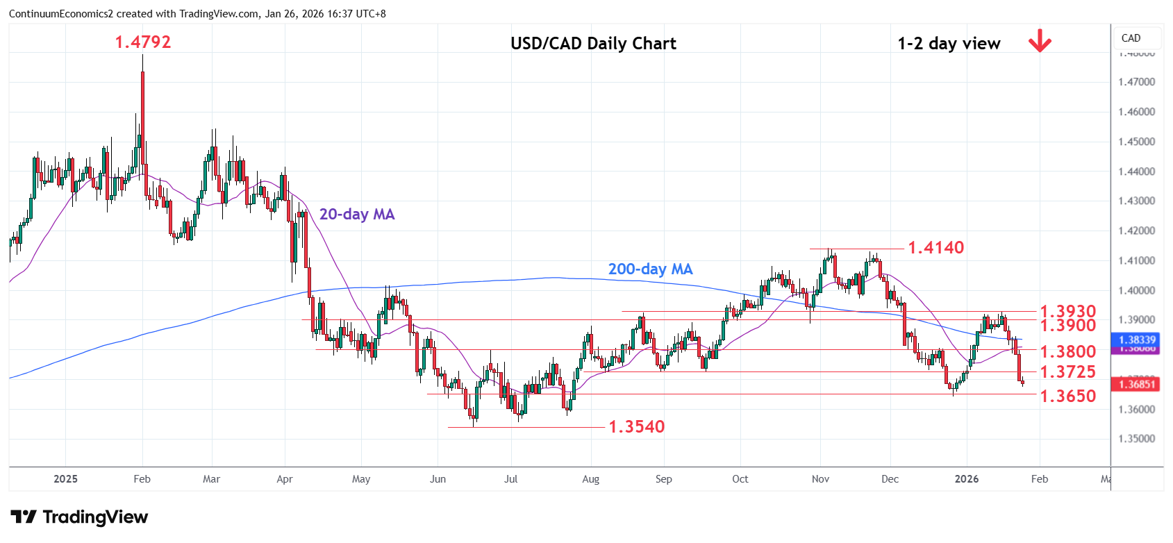 08:50 GMT - Break of the 1.3700 level see prices extending losses from resistance at the 1.3930 high and threaten retest of 1.3650/40 support. Negative daily and weekly studies threatens break open up room for retest of July lows at 1.3575/55. Below this will turn focus to the 1.3450, June 2025 year low. Break here will further retrace the 2021/2025 rally. Meanwhile, resistance is lowered to 1.3725/1.3800 congestion area which is expected to cap and sustain losses from the 1.3930, 16 January high.