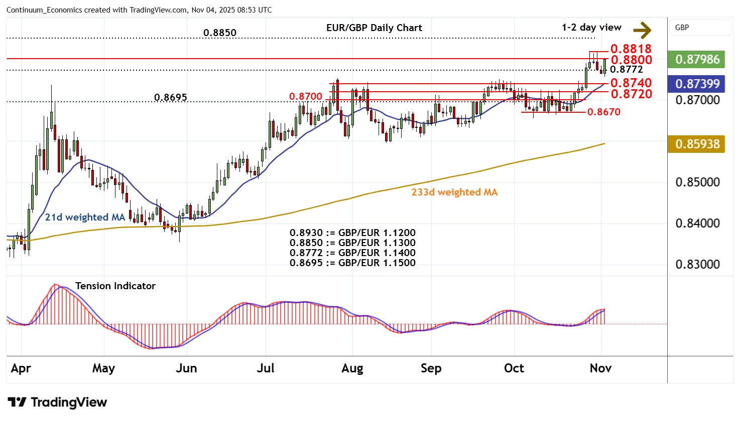 08:45 GMT - The anticipated test below support at 0.8772, (GBP/EUR 1.1400), has bounced from 0.8755~, as oversold intraday studies unwind, with prices breaking back above 0.8772 to consolidate around 0.8790. Focus is on strong resistance at 0.8800 and the 0.8818 current year high of 29 October. But mixed/negative daily readings are expected to limit any initial tests in consolidation. Broader weekly charts are rising, pointing to potential for later gains. But a close above here is needed to improve price action and extend December 2024 gains initially towards strong resistance at 0.8850. Meanwhile, any fresh tests below 0.8772 should meet buying interest above support within 0.8720/40.