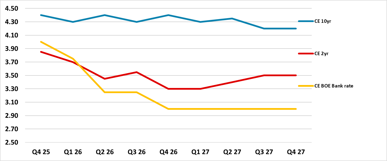 · 2yr Gilt yields have scope to fall through 2026, as we see growth and inflation slowing more than the BOE and this will likely see the MPC changing view and cutting policy rates to 3.25% in H1 2026. Though a pause could then be seen, we see one final BOE cut then being delivered to 3.0%. 10-2yr yield curve steepening will likely be evident in 2026, as the supply pressures (QT and extra borrowing beyond the budget deficit) will only lessen from September 2026 with a further slowing of BOE QT. Additionally, ongoing UK political flux, and the concerns that internal Labour politics could mean a rework of the UK fiscal rules, will likely mean that 10yr gilt yields find it difficult to fall below 4% consistently in H2 2026 and 2027.