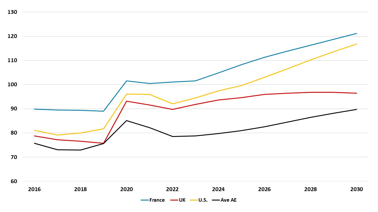Figure 1: UK, France, U.S. Net General Government Debt/GDP (%)