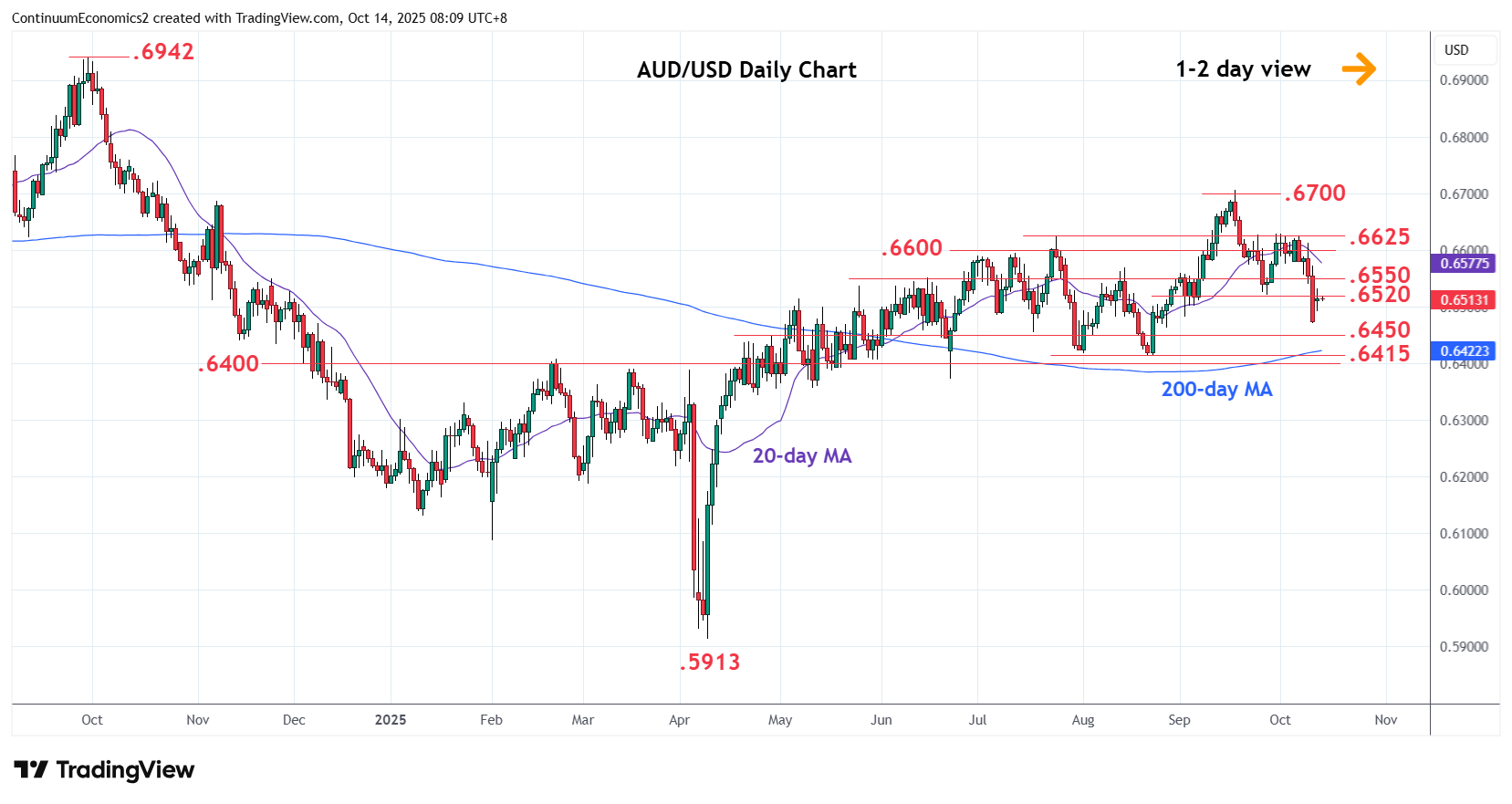 00:15 GMT - Turned up from the .6470 low to consolidate above the .6500 level as prices unwind the oversold intraday studies. Bounce see resistance at the .6520/.6550 congestion area which is expected to cap and keep pressure on the downside. However, daily studies have turned mixed and suggest consolidation likely to extend before giving way to fresh selling pressure later. Below the .6500 will expose the .6470 low to retest. Lower will scope to the .6450 congestion then the strong support at .6415/00 area.