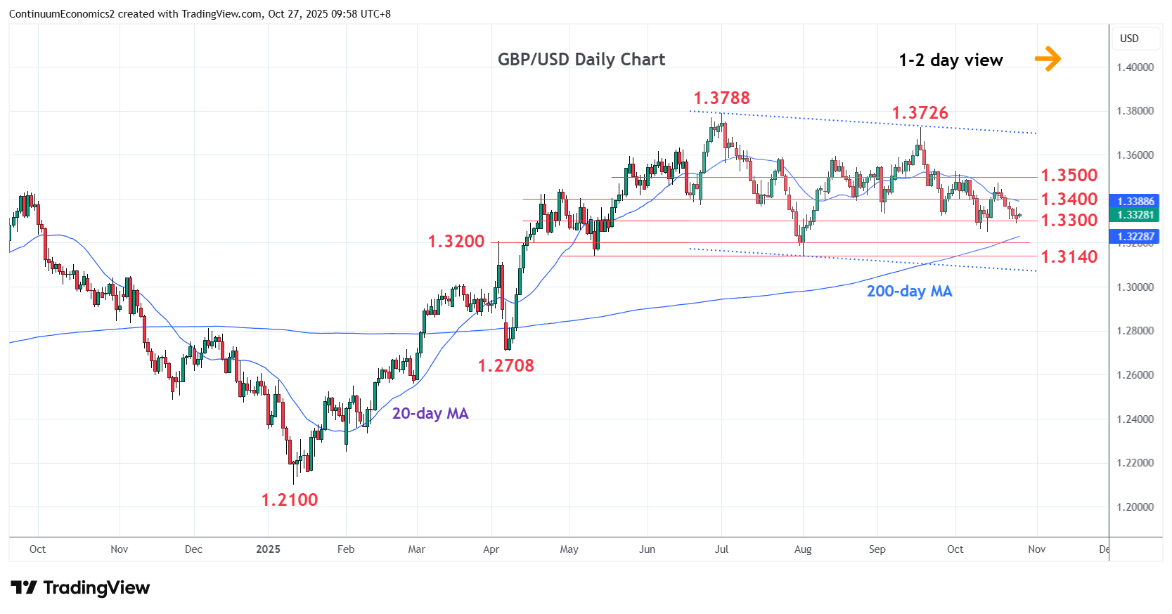 01:50 GMT - Limited on break of the 1.3300 level as prices consolidate losses from the 1.3471 high. However, negative daily and weekly studies keeps pressure on the downside and threaten break here to turn focus to the 1.3248, 14 October low. Below this will extend the broader losses from the 1.3726 September high. Meanwhile, resistance is at the 1.3400 congestion which is expected to cap. Would need to regain this to ease the downside pressure and clear the way for stronger gains to retrace losses from the 1.3726, September high.