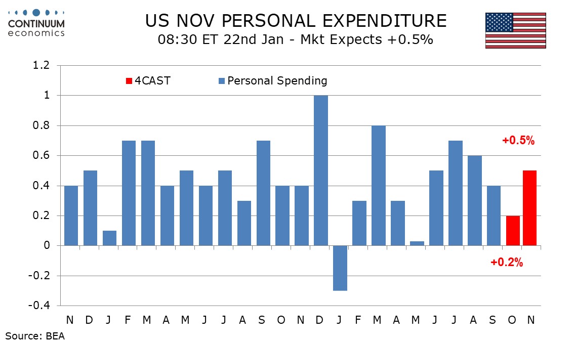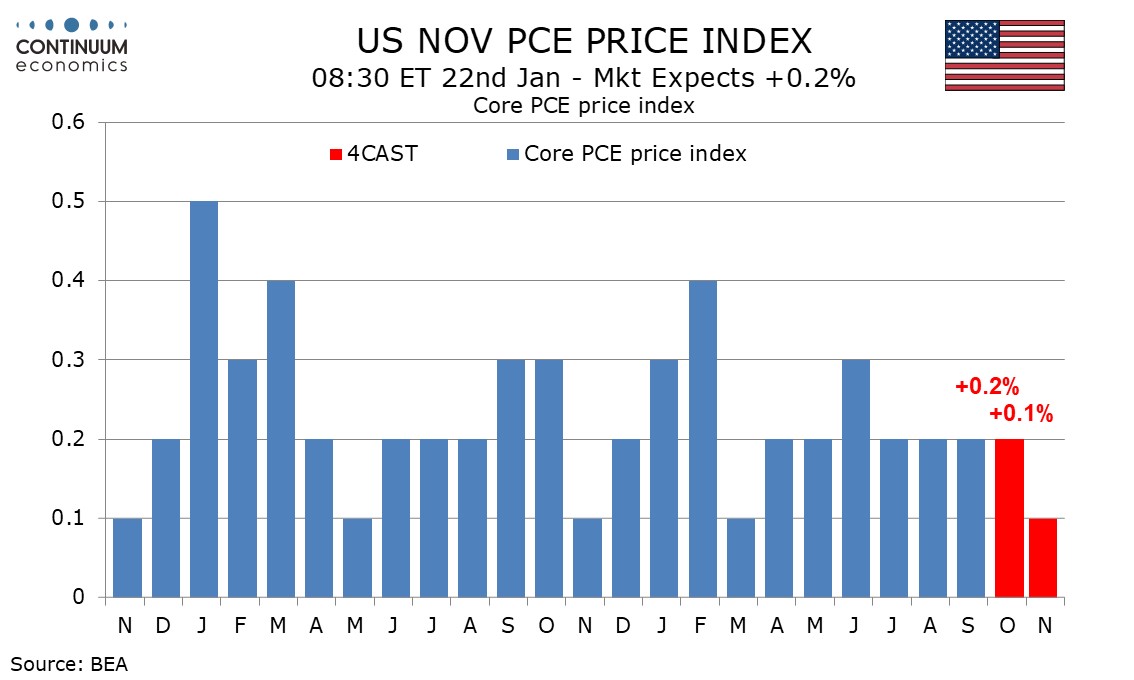 January 22 will see a personal income and spending report for both October and November. We expect personal income to rise by 0.4% in October and 0.5% in November and personal spending to rise by 0.2% in October and 0.5% in November. For core PCE prices, we expect gains of 0.2% in October and 0.1% in November. For Q4, gains slightly above 2.0% for real disposable income, real personal spending and core PCE prices all look likely.
