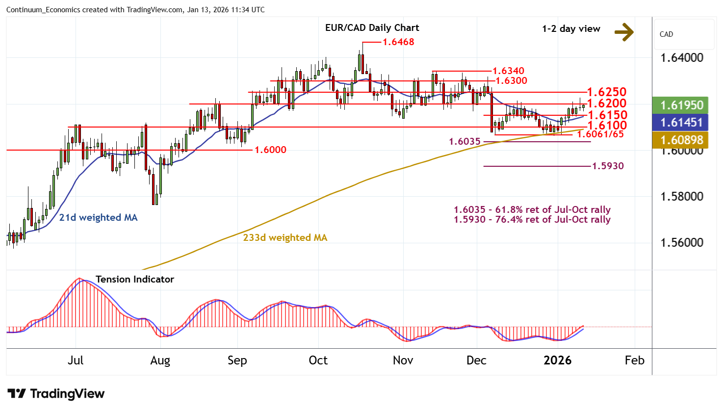 11:50 GMT - Consolidation around congestion resistance at 1.6200 has given way to a pullback to 1.6170~, before bouncing smartly to once again pressure 1.6200. Mixed intraday studies suggest potential for further consolidation around here, before rising daily readings prompt a break and open up resistance at 1.6250. However, mixed weekly charts are expected to limit any initial tests in fresh consolidation. Meanwhile, support remains at congestion around 1.6150. A break beneath here, if seen, should be limited in renewed buying interest/consolidation above further congestiona round 1.6100.