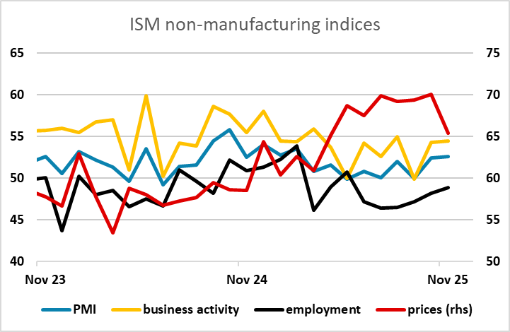 The USD has gained a little on the slightly stronger than expected non-manufacturing ISM just released, but the data is close enough to expectations not to have a significant impact on policy expectations. While the ISM PMI is a little higher, along wit the employment and business activity indices, the price index is lower and that should support expectations of Fed easing. However, this breakdown is slightly more risk friendly, so might be supportive for the AUD and other risky currencies.
