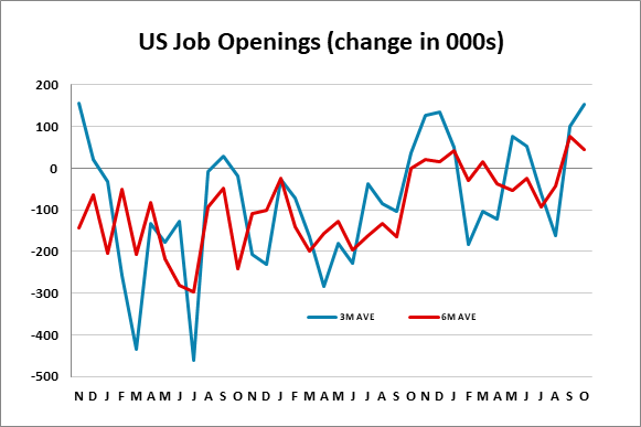 Hirings fell by 218k in October after a 241k increase in October, while separations fell by 214k in October after a 153k increase in September. The difference between hires and separations was 99k in October after a 103k increase in September, both stronger than seen in June, July and August. September’s difference is close to consistent with a 119k increase in September’s non-farm payroll. October’s 99k difference suggests October payrolls may hold up better than most expect.