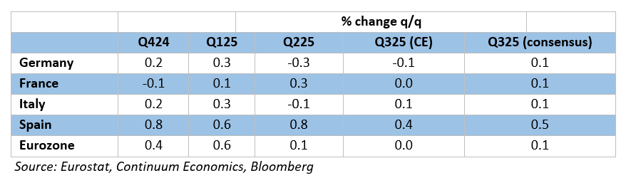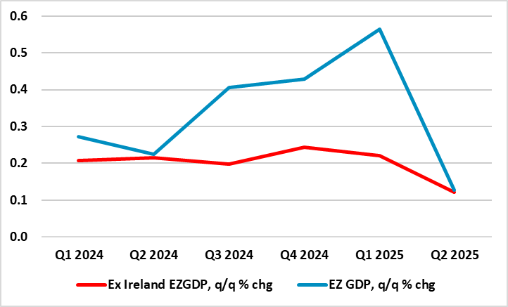 As we highlighted repeatedly of late, for an economy that has seen repeated upside surprises and apparently above trend growth, now some 1.4% in the year to Q2, GDP data do not seem to have had much impact is shaping, let alone dominating, ECB policy thinking. But we think this may shift as the ECB begins to question its recent mantra that the economy has been resilient, not least by accepting that EZ underlying growth has been nowhere need that of the recorded headlines. It is possible that the Q3 GDP data may help trigger this as we anticipate a modest downside surprise of zero q/q (Figure 1), this however also tallying with the ECB projection. More likely, ECB thinking may be slower to shift as shorn of details, this flash data would be down but only from what was an upwardly distorted Q1 result and a softer Q2 picture and would still come with continued marked divergences within the main EZ economies. Instead, and for the time being, the ECB seems to be in a much more risk management frame of mind and where policy freedom has been granted by clear disinflation. Those risks are obviously (but not solely) centred around the tariff outlook but also reflect a fuller and more sobering assessment the overall EZ monetary stance.