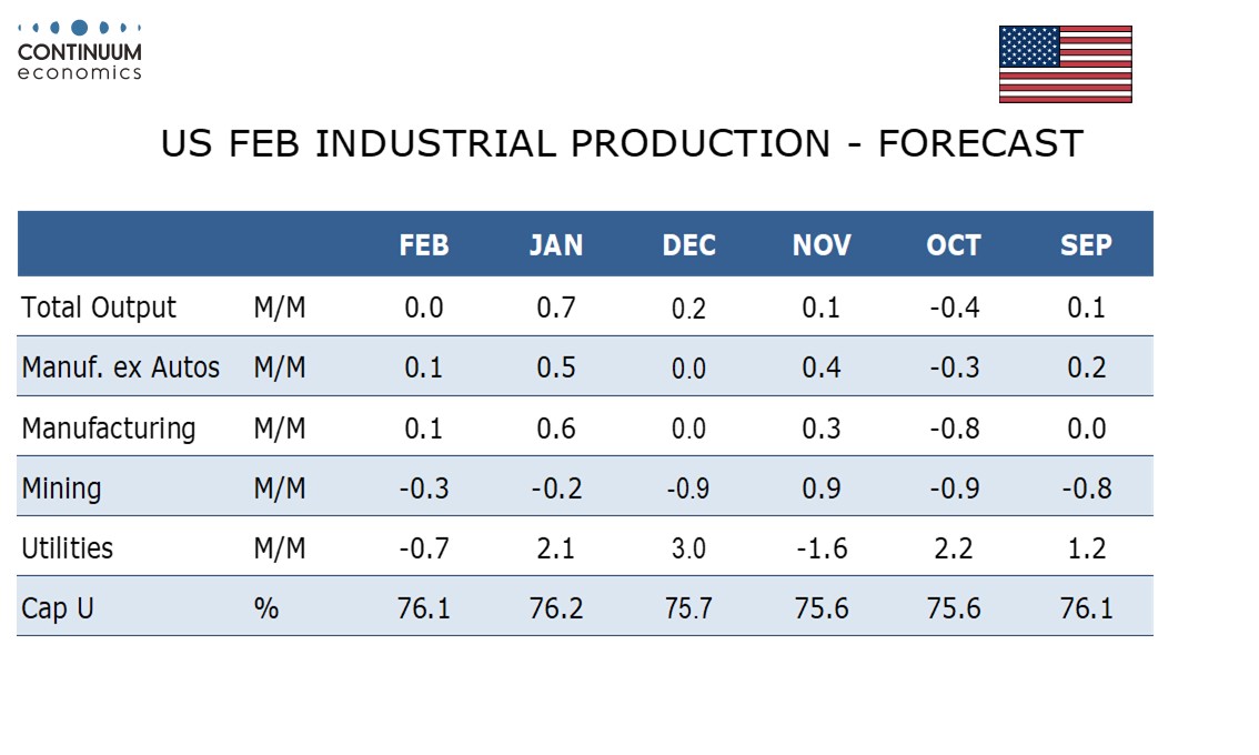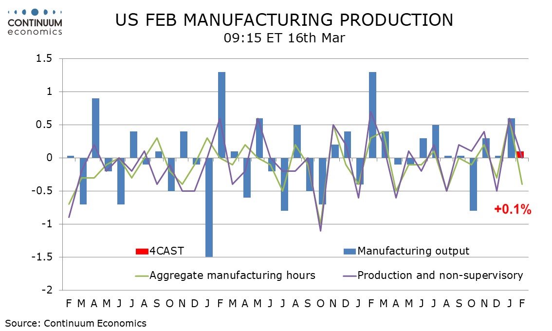 We expect an unchanged February industrial production total to follow a strong 0.7% increase in January. For manufacturing we expect a 0.1% increase to follow a 0.6% rise in January. Despite the subdued February forecast, trend appears to be picking up.
