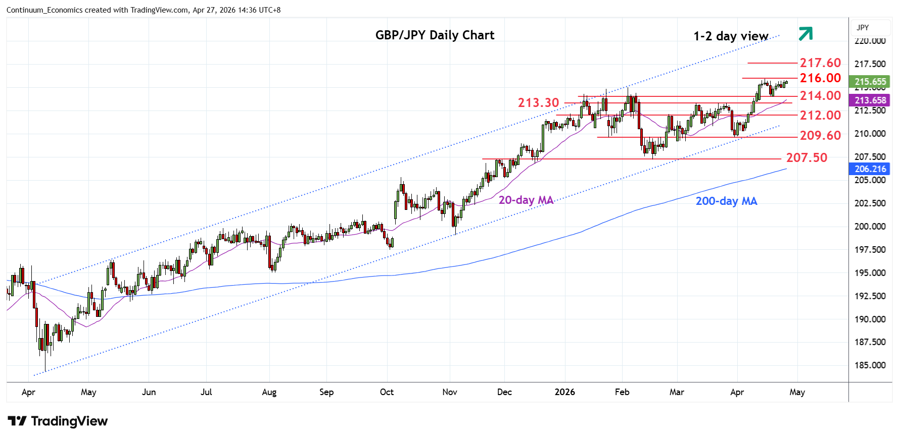 06:40 GMT - Poised for retest of the 15 April current year high just below the 216.00 level following bounce from the 214.00 low last week. Break will further extend gains within the bullish channel from the April 2025 year and see room for extension to resistance at 217.60, January 2008 year high. However, overbought daily studies caution corrective pullback with support raised to the 214.00/213.30, congestion area and March high. Would take break here to fade the upside pressure and see room for deeper pullback to retrace gains from 207.50 February current year low.