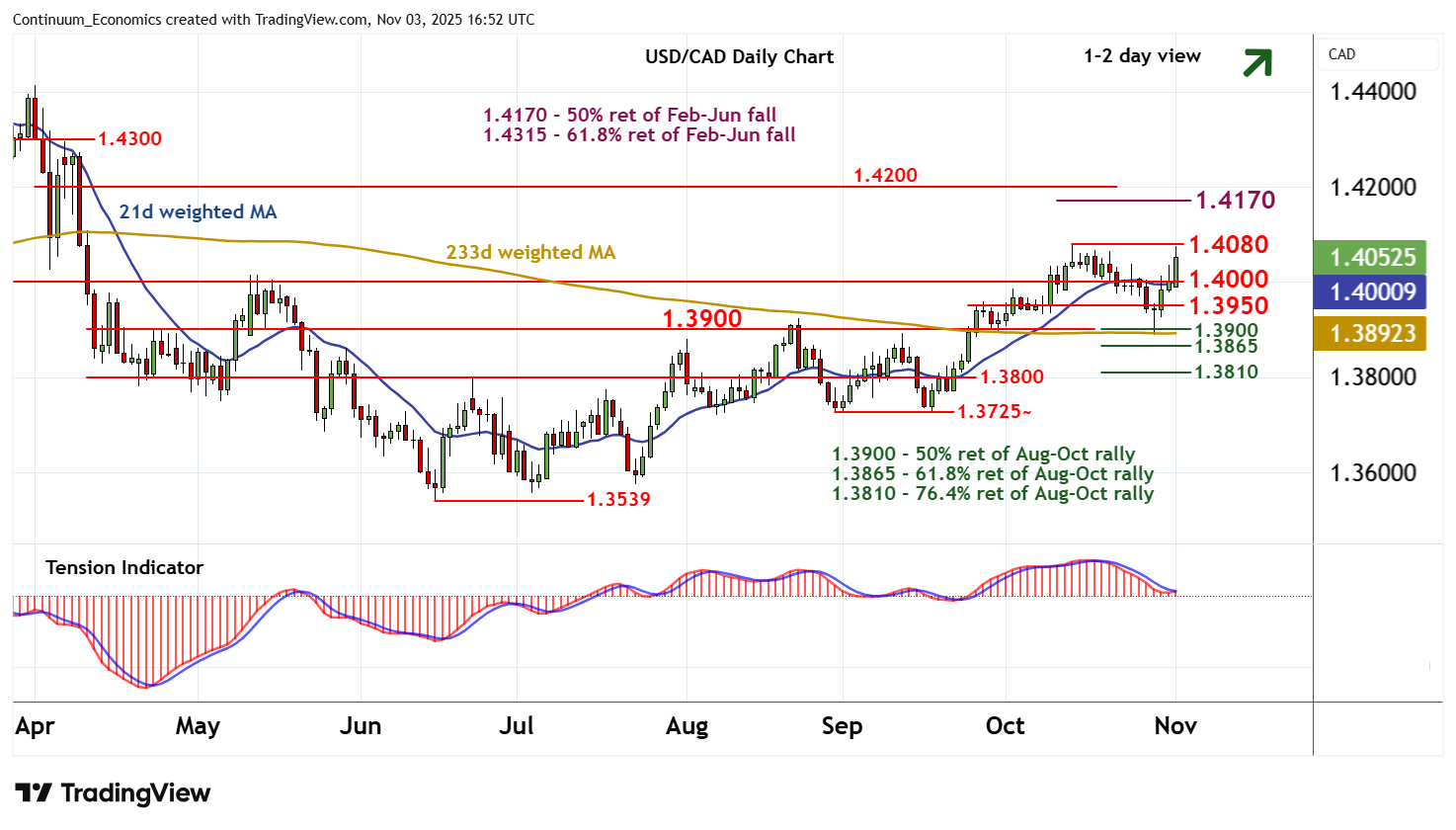 16:35 GMT - Consolidation around 1.4000 has given way to the anticipated test of strong resistance at the 1.4080 weekly high of 14 October. Daily readings continue to rise and broader weekly charts are mixed/positive, highlighting room for further strength in the coming sessions. A close above here will improve price action and extend mid-June gains towards strong resistance at the 1.4170 Fibonacci retracement and congestion around 1.4200. However, already overbought weekly stochastics are expected to limit any initial tests in consolidation. Meanwhile, support remains at the 1.4000 break level, and should underpin any immediate setbacks.