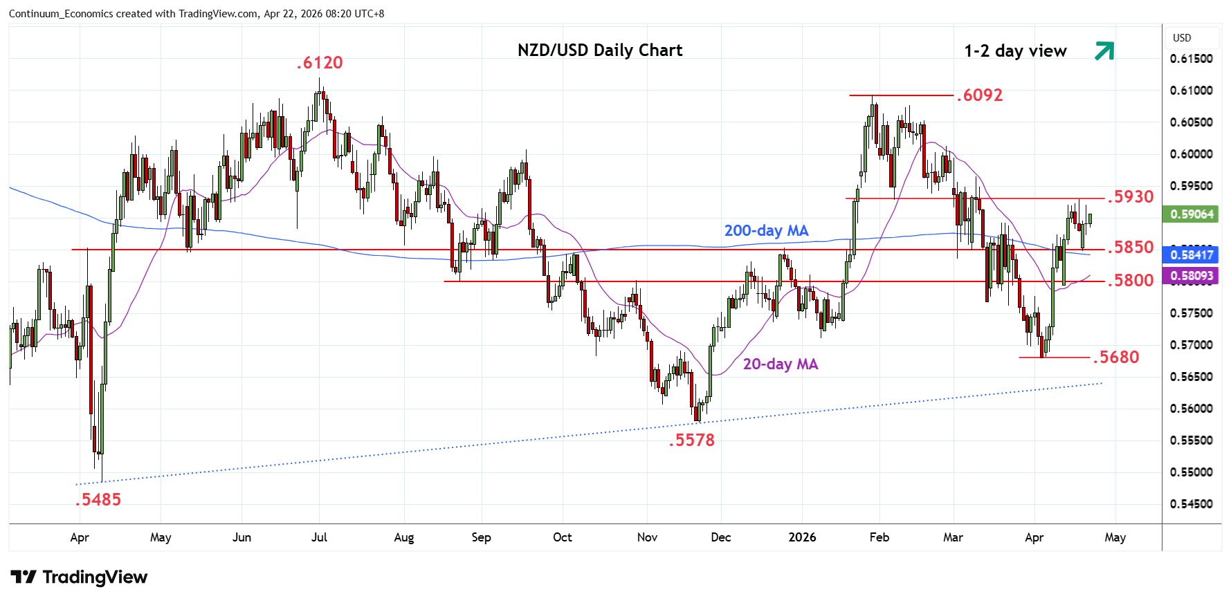 00:30 GMT - Bounce from the .5850 support see pressure returning to the upside and see potential for retest of the .5930 resistance. Clearance here will extend gains from the .5680 low of 3 April and see room to .5950 congestion. Higher still, will turn focus to the .6000/10 figure and 26 February high. Meanwhile, support at .5850 congestion should underpin. Failure here will open up room for deeper pullback to retrace gains from the .5680 low and open up room for corrective pullback to the .5800/.5795 congestion and 13 April low.