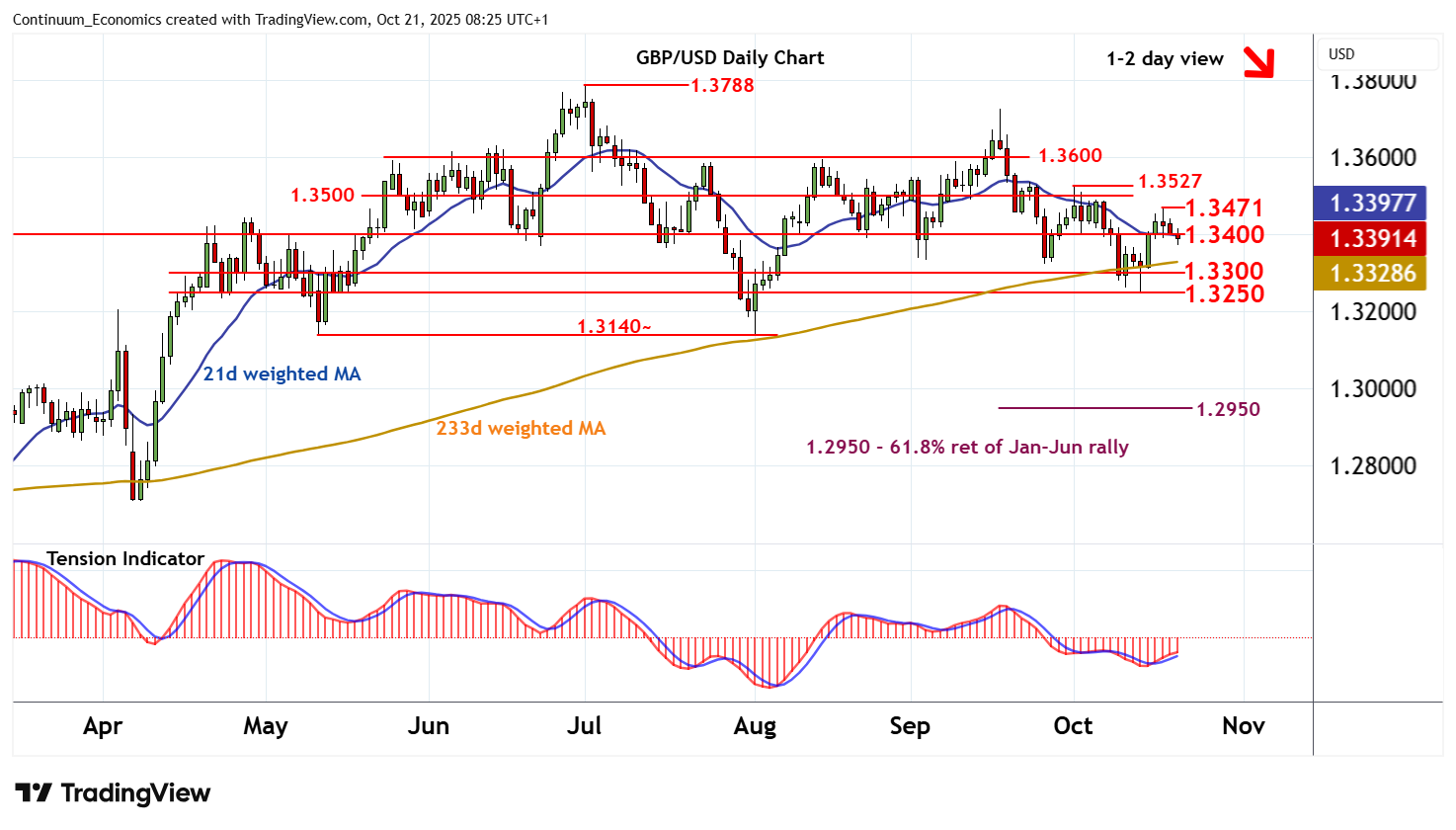 08:10 BST - Cautious trade is giving way to the anticipated break below 1.3400, with prices currently trading around 1.3385. Intraday studies are under pressure and overbought daily stochastics are unwinding, highlighting room for deeper reactions. Support is down to congestion around 1.3300, but the positive daily Tension Indicator is expected to limit any initial tests in consolidation. Broader weekly charts are coming under pressure. But a close below 1.3250 is needed to turn sentiment negative and extend mid-September losses towards further congestion around 1.3200. Meanwhile, a close back above congestion resistance at 1.3400 would help to stabilise price action and give way to consolidation beneath the 1.3471 weekly high of 17 October.