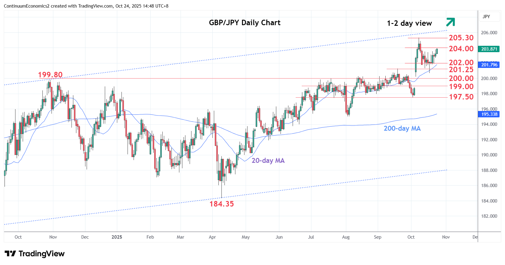 07:00 GMT - Break above resistance at the 203.50 congestion has seen prices extending gains to reach the 204.00 level. Daily studies are tracking higher and suggest scope for break here to open up the 205.30 current year high to retest. Would expect reaction here but a later clearance cannot be ruled out. Higher will see room for extension to the 206.00 congestion and equidistant channel from July 2024 low. Meanwhile, support is raised to 202.00 level which should underpin. Break here will return focus to the downside for retest of 201.25 low and the gap area at 200.20/198.85.